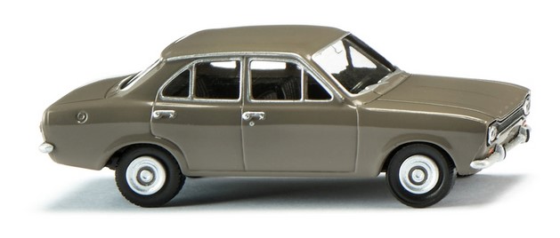 Dieser Escort ist nur auf den ersten Blick eine graue Maus Wer zum Ende der sechziger Jahre bei der Fahrzeugwahl nicht den grellen Flowerpower-Lack wünschte, der wählte klassisches Grau. Das ändert nichts an den Werten, die die damalige Ford-Limousine als Fünftürer mitbrachte. Für die britischen Ford-Werke sollte der Escort Mark I ein Glücksgriff in ihrer Modellpolitik werden. Auf der Insel entwickelten die Konstrukteure den ersten Escort, der sich wegen des charakteristischen Kühlergrills schnell den zweifelhaften Kosenamen Hundeknochen erworben hatte! Ab November 1967 lief der erste Escort im britischen Halewood vom Band und konnte rasch die Herzen erobern. Die Verkaufszahlen übertrafen die optimistischen Erwartungen des Herstellers bereits nach zwei Monaten um 30%. In Deutschland verließ schließlich der erste Wagen am 16. Januar 1970 in Saarlouis das Fließband der Escort Mark I wurde bis 1974 erfolgreich gebaut. Karosserie (viertürig) quarzgrau, Fahrgestell schwarzgrau. Inneneinrichtung in schwarz mit Lenkrad in schwarzgrau gehalten. Kühlergrill in schwarzgrau mit gesilbertem Rahmen. Frontscheinwerfer transparent, Heckleuchten rottransparent eingesetzt. Felgen silber. Stoßstangen gesilbert. Stoßstangenhörner schwarz koloriert. Frontseitig silberner Ford-Schriftzug sowie orange bedruckte Blinker. Silberzierrat an den Fahrzeugseiten sowie an Front und Heck. Rahmen der Rückleuchten sowie Türgriffe gesilbert. Kofferraumhaube mit Schriftzug Ford und Escort sowie Schloss in silber.