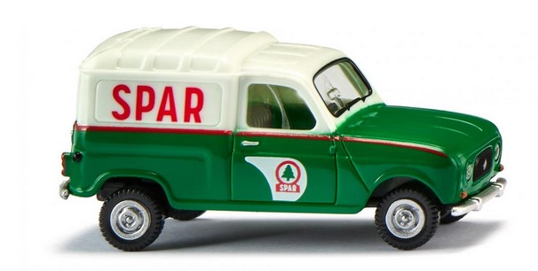 Transportwunder vom Großmarkt auf dem Weg zum Spar Was will man mehr, wenn man als Händler viel Ware vom Großmarkt zum Laden transportieren will Der R4 mit seinem mächtigen Kastenaufbau macht es möglich wie kein zweiter Transport-Pkw jener Jahre. Schon in den Sechzigern verschaffte sich der Franzose einen guten Ruf und war bei den damaligen Spar-Läden im Einsatz. Die markante zweifarbige Weiß-Grün-Gestaltung mit dem Spar-Logo auf der Tür macht aus dem Renault-Modell einen modellbauerischen Zeitzeugen. Der Koffer der 1:87-Miniatur lässt sich am Kofferdach öffnen. Genau diese Eigenschaft machte den R4 mit dem Transportkoffer zum Alltagsallrounder. Das Vorbild der Fourgonette wurde bis 1967 gebaut, bevor der Renault-Rhombus im Kühlergrill nach rechts wanderte. Karosserie oben weiß, unten minzgrün. Inneneinrichtung mausgrau gehalten. Fahrgestell schwarz. Fensterrahmen und Scheibenwischer schwarz bedruckt, Blinkerleuchten orange. Türen mit Spar-Logo und silbernen Türgriffen. Umlaufend rote Zierleisten sowie heckseitig silberner Türgriff und Renault-Schriftzug. Aufbau mit rotem Spar-Schriftzug. Fensterrahmen sowie Tankverschluss schwarz. Kühlergrill mit silbernen Zierleisten sowie Renault-Logo.