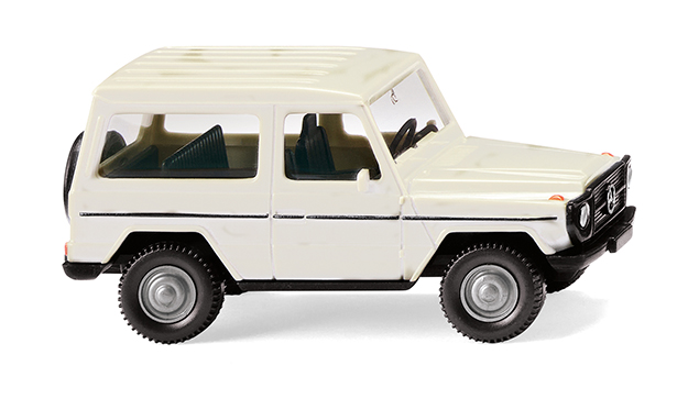 G-Klasse läutete bei Mercedes-Benz die SUV-Zukunft ein Gleich nach der Premiere lässt WIKING die farbaktualisierte Variante in kieselgrauer Gestaltung folgen. Die späte Realisierung der damaligen Modellbauidee von WIKING-Chef Fritz Peltzer wurde nach Bekanntwerden von allen Sammlern goutiert so sieht wirkliche Modellbaugeschichte aus. Ebenso erfreulich wie zufällig hatten sich im WIKING-Archiv die vollständigen Konstruktionsvorlagen von damals und zwar nicht nur für den 1979 vorgestellten MB G in der langen, sondern auch in der kurzen Version wiedergefunden. Offenbar hatten mehr als 40 Jahre zurück auch Gespräche mit Mercedes-Benz über einen Industrieauftrag eine Rolle gespielt, denn schon 1980 stellte WIKING das allseits bekannte G-Modell vor. Karosserie kieselgrau, Inneneinrichtung schwarz mit schwarzem Lenkrad. Fahrgestell mit Anhängerkupplung schwarz. Felgen silber. Blinker auf den Kotflügeln orange bedruckt. Scheinwerfer und Mercedes-Benz-Stern auf schwarzem Kühlergrill silbern bedruckt. Seitliche Schutzleisten und Türgriffe schwarz. Rückleuchten rot bedruckt. Heckseitiger Türgriff und Tankstutzen schwarz. Reserveradabdeckung mit silbernen Mercedes-Benz-Stern.