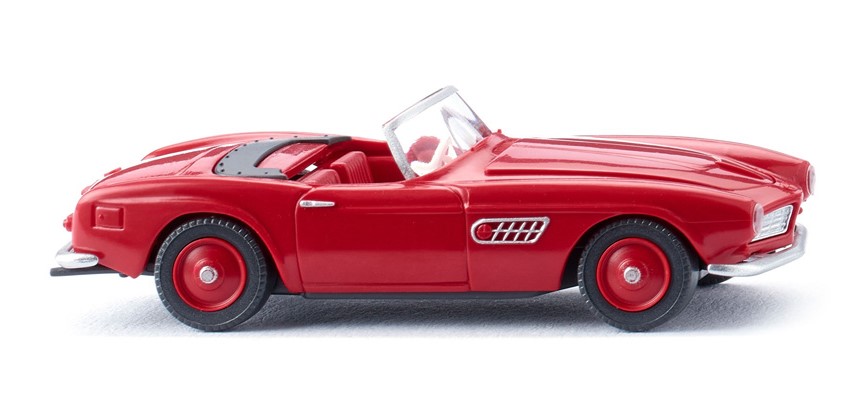 Der Roadster als Traum von der Isar gehuldigt Der BMW 507 galt weltweit als einer der schönsten Sportwagen der 1950er-Jahre, viele halten ihn bis heute für das schönste Automobil aller Zeiten. Als der Wagen im September 1955 auf der IAA in Frankfurt erstmals vorgestellt wurde, feierte ihn die Presse als Traum von der Isar. Seine Form besitzt ikonischen Charakter und gilt bis heute als zeitlos. Vorgestellt wurde der BMW 507 bereits 1955 auf der Frankfurter IAA, ging damals mit einem 150 PS starken V8-Motor mit 3.168 cm³ Hubraum an den Start, um dem legendären Mercedes-Benz 300 SL Flügeltürer Paroli zu bieten. Tatsächlich ist der BMW 507 deutlich kompakter und auch im Hinblick auf die erreichten Stückzahlen und erhalten gebliebener Exemplare deutlich seltener als der 300 SL. Lediglich 252 Einheiten wurden zwischen 1956 und 1959 ausgeliefert der Preis lag damals bei rund 26.000 Mark. Bis heute stieg der Sammelwert auf über 700.000 Euro. Bei WIKING zählt der BMW 507 inzwischen zu den Klassikern aus neuen Formen und damit zu den Meilensteinen der deutschen Automobilhistorie. Karosserie in rot, rote Einrichtung mit weißem Lenkrad und Verdeckeinsatz in schwarzgrau. Fahrgestell in schwarzgrau. Stoßstangen und Felgen chromsilber eingesteckt. Zierleisten und Kühlergrillrahmen sind vorbildgerecht gesilbert, ebenso die Lufteinlässe vorn. Rückleuchten rot bemalt.