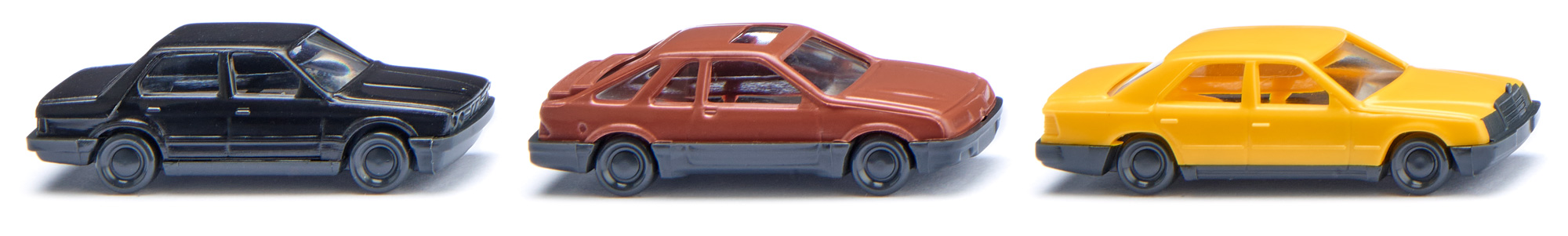 Achtzigerjahre-Trio von Mercedes-Benz, BMW und Ford Nichts ist passender, als sich in der 160-fachen Miniaturisierung auch der Achtzigerjahre zu erinnern. WIKING verkleinerte einst die 1:87-Modelle von BMW 320i, Mercedes-Benz 260 E und Ford Sierra XR4. Karosserien wechselweise schwarz, gelb und kupferbraun. Fahrgestell schwarzgrau gehalten.