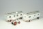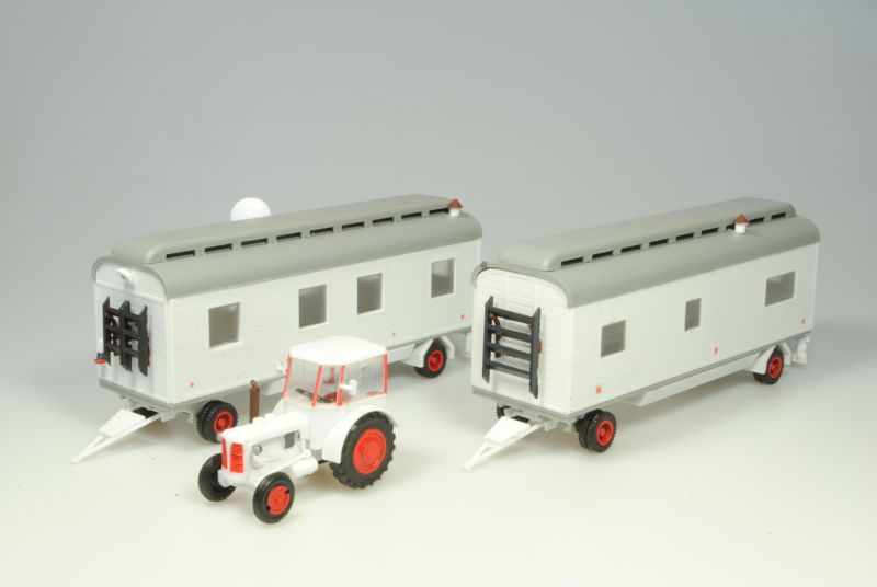 Bausatz eines Traktor Zetor 50 mit 2 Zirkus-Wohnwagen. Der Bausatz enthält eingefärbte Bauteile aus Kunststoff, Klarsichteile und Abziehbilder für die Beschriftung.