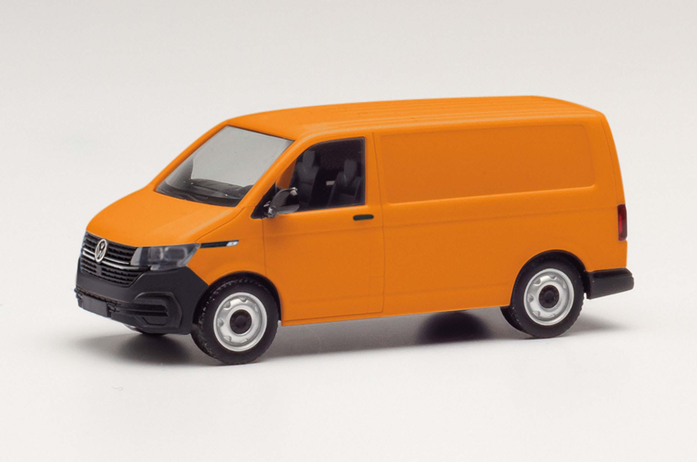 Formneuheit! Auch als Kastenwagen wurde von Herpa der neue VW T 6.1 als hochwertige Miniatur umgesetzt. Das zunächst in Leuchtorange angebotene Modell des Transporters wird mit schwarzen Stoßfängern zur Auslieferung kommen.