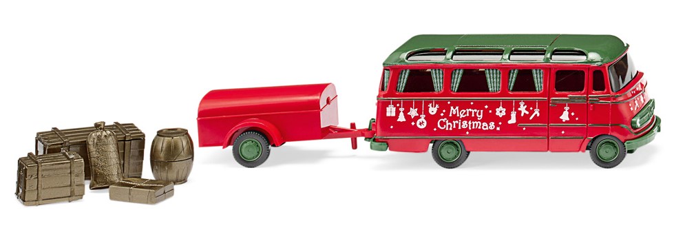 Weihnachtsmann mit einem Bus voll Engeln und Geschenken Dieser Klassiker steht dem Weihnachtsmann gut zu Gesicht. WIKING hat sich zum Weihnachtsfest 2023 den Kleinbus Mercedes-Benz O 319 vorgenommen, der für eine Reise durchs Weihnachtsland so prädestiniert erscheint. Platz für Engelbegleitung gibt es genug und die Geschenke werden im zeitgenössischen Anhänger verstaut. WIKING hat für den O 319 sogar die Gardinen an den Fenstersäulen ausgestaltet eine schöne Aufwertung zeitgenössischer Gewohnheit und Prägung. Die mit einem zulässigen Gesamtgewicht für bis zu 3,9 Tonnen entwickelte Baureihe wurde auf der IAA 1955 präsentiert. Viele Neugründungen von Busunternehmen wählten fortan gern den O 319, weil er sich für das prosperierende Geschäft von Betriebsausflügen bestens eignete. 1967 lief der letzte O 319 in Düsseldorf vom Band. Karosserie karminrot. Fahrgestell mit Anhängerkupplung und Kardanteil sowie Kühlergrill und Felgen smaragdgrün. Verglasung dunkel abgetönt. Rückleuchten rot bedruckt. Seitliche Flanken sowie Dachfläche mit Weihnachtsmotiv bedruckt. Umlaufende Zierleisten gesilbert. Verglasung mit Gardinen-Optik bedruckt. Anhänger karminrot. Goldenes Ladegut.
