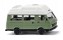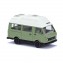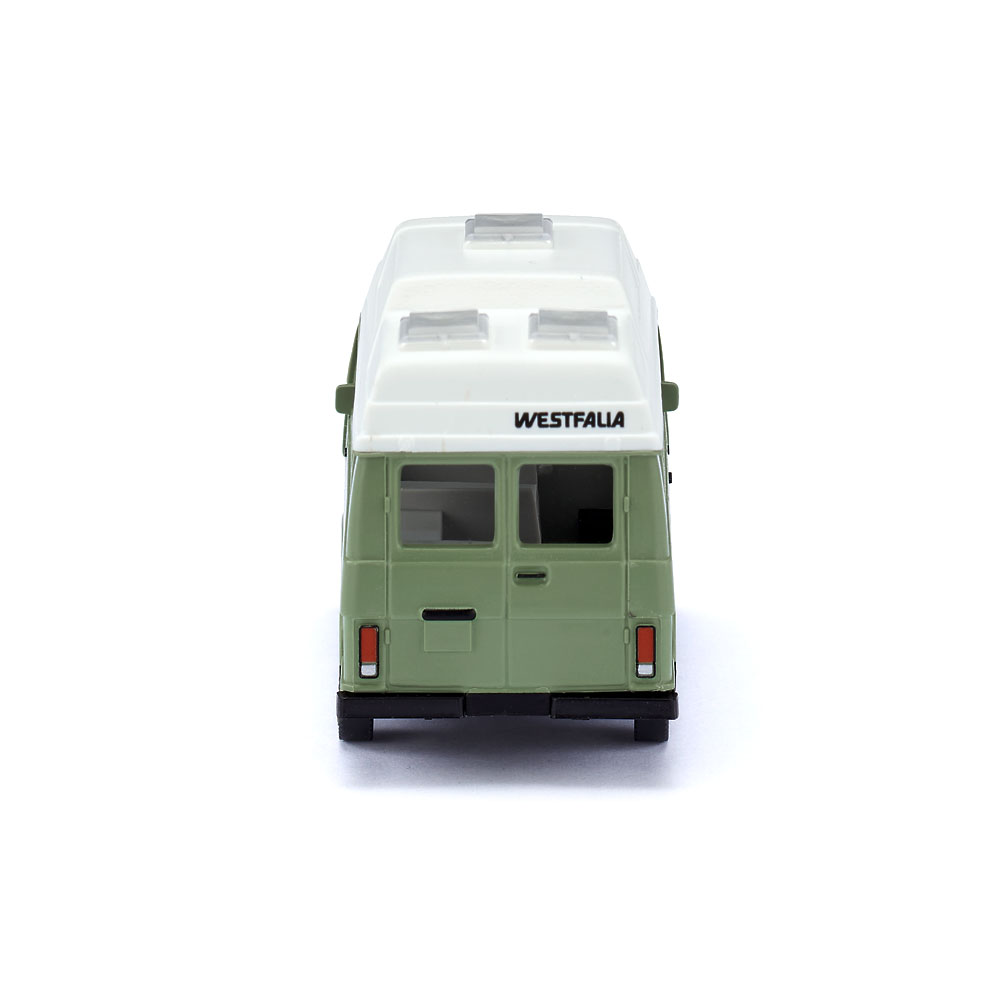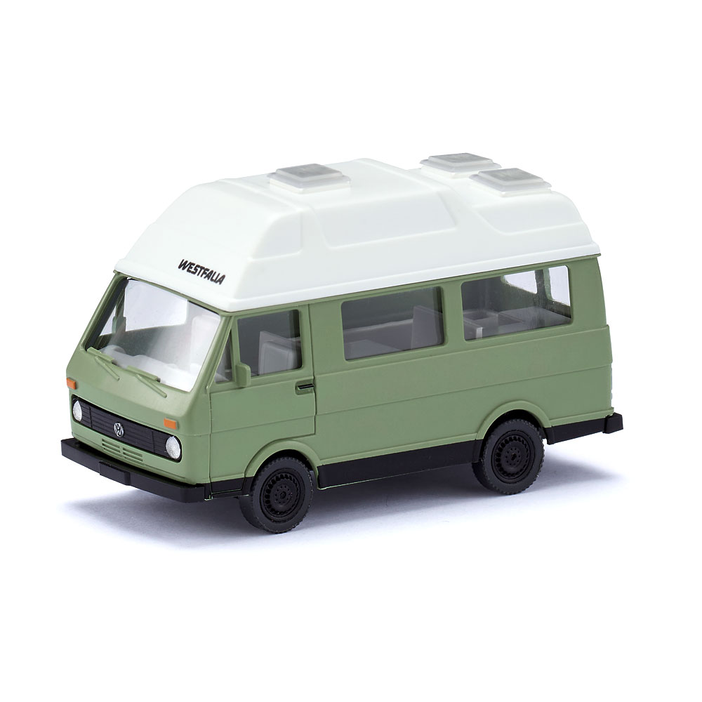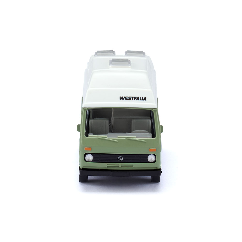 Westfalia machte den VW LT zum Alltagscamper Es musste in den Siebziger- und Achtzigerjahren nicht immer ein formvollendetes Wohnmobil sein, um für Begeisterung zu sorgen. Manchmal tat es eben auch ein klassischer Transporter wie der VW LT mit Hochdach, den WIKING sich in der Westfalia-Ausstattung zum Vorbild nahm. Das Platzangebot des Originals überzeugte, wenngleich die Camper den klassischen Transportercharakter nicht ablegen konnten. Das Modell steht hingegen für die zeitgenössische Bandbreite von Wohnmobilen in jenen Jahren und die wirtschaftlichen Überlegungen ihrer Besitzer, die lieber ein Serienfahrzeug ohne kostspieligen Karosserieumbau präferierten. Karosserie hellgrün, Hochdach weiß. Sitzreihe mit Lenkrad dunkel-achatgrau, Inneneinrichtung lichtgrau. Fahrgestell mit Kühlergrill schwarz. Vorderes VW-Logo silbern bedruckt, Blinker orange. Türgriffe und seitliche Streifen schwarz. Rückleuchten rot, Rückfahrlichtern silbern bedruckt. Vorne und hinten schwarzer Westfalia-Aufdruck.