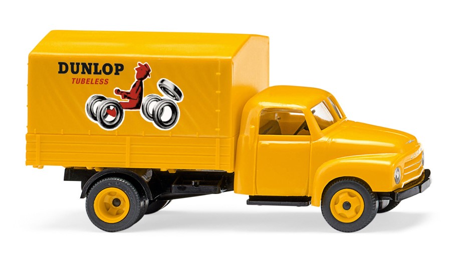 Neue Plane für den Opel Blitz Langhauber WIKING spendiert dem altgedienten Opel Blitz der Fünfzigerjahre eine neue Plane. Damit erscheint der Langhauber authentischer denn je. Denn der Faltenwurf der neuen Plane lässt den Klassiker wesentlich zeitgenössischer erscheinen, zumal er in den Farben des traditionsreichen Reifenherstellers erscheint. Die Rüsselsheimer Automobilbauer ließen den Opel Blitz mit frischer Langhaube und chromblitzendem Kühlgrilldekor schon 1952 vom Band laufen er kam gerade richtig, so dass die Stückzahlen innerhalb weniger Monate in die Höhe schnellten. Fahrerhaus und Pritsche, Plane und Felgen signalgelb. Inneneinrichtung und Lenkrad staubgrau. Fahrgestell mit Kardanwelle schwarz. Seitlich mehrfarbige Planenbedruckung mit Motiv Dunlop Tubeless. Heckseitig schwarzer Dunlop-Schriftzug.