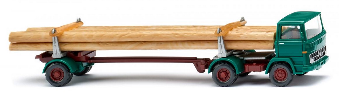Im Forst: Erst der Hauber, dann die kubische Generation Eigentlich waren es die Hauber, die im Forstbetrieb der Bundesrepublik in den Sechzigerjahren das Sagen hatten. Auch bei WIKING, wo der Mercedes-Benz Kurzhauber diese Aufgabe übernommen hatte. Doch mit dem Mercedes-Benz LPS 1317 hielten auch die Frontlenker Einzug in den Transport von Langholzfracht. Nun zieht die kubische Generation in 1:87 wieder die schwere Fracht der gefällten Baumstämme ins Programm. Einst hatte WIKING das Gespann sogar noch mit der NG-Zugmaschine ausgestattet - der Langholztransporter sollte im Modellprogramm zum Dauerläufer werden. Fahrerhaus und Kotflügel opalgrün, Inneneinrichtung olivbraun. Schwarzer Kühlergrill mit silbernen Zierleisten und Mercedes-Benz-Stern. Fahrgestell, Nachläufer und Felgen oxidrot. Blinker tieforange bedruckt, Türgriffe gesilbert. Rücklichter verkehrsrot ausgeführt.