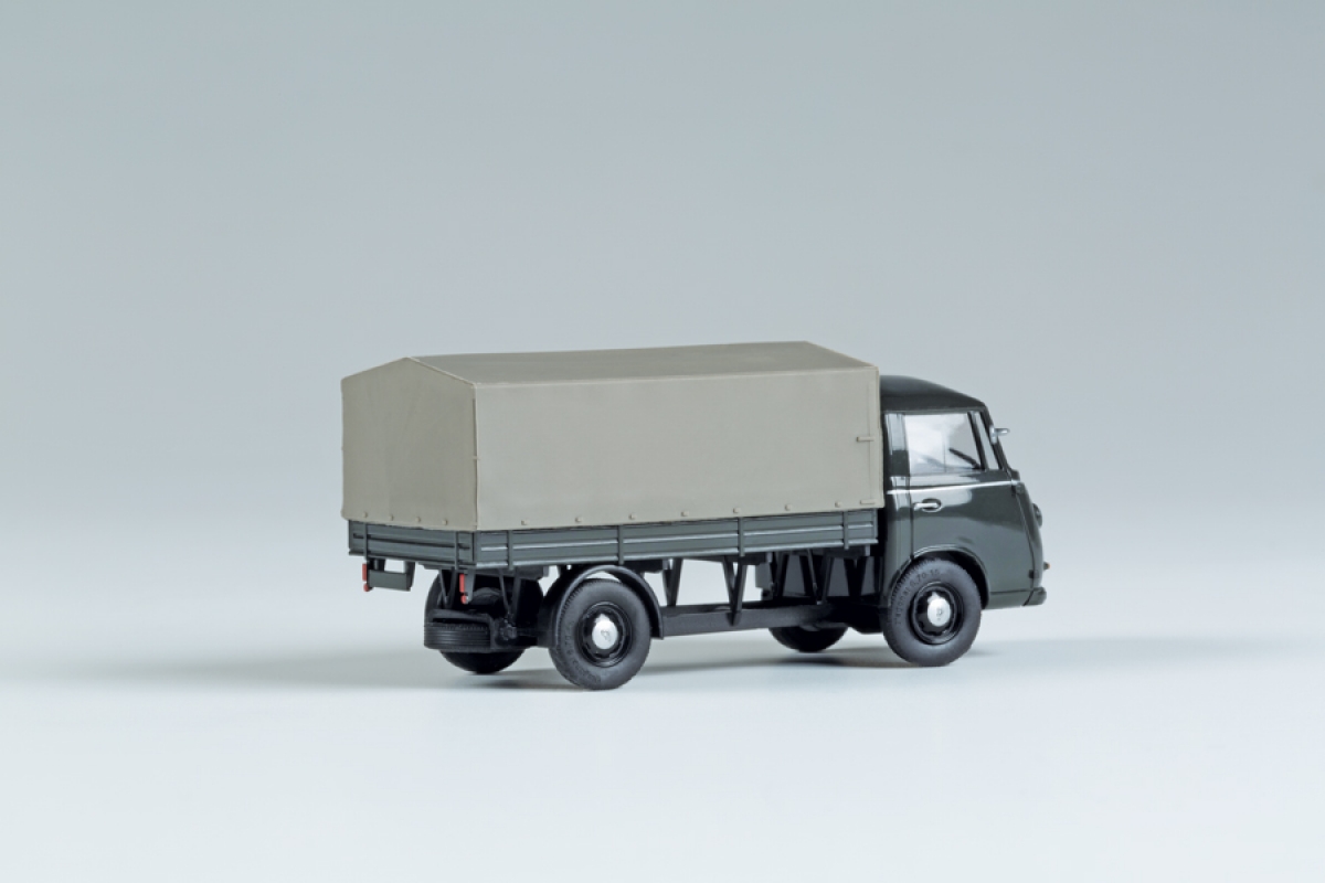 Goliath Express 1100 Pritschenwagen mit Plane grau - Goliath Express 1100Fertigmodell mit detaillierter Bedruckung. Mit rund 4,6 m² fiel die Ladefläche des Pritschenwagens recht groß aus. Diese wurde u?ber eine aufwendige V-förmige Stu?tzkonstruktion mit dem Fahrgestell verbunden. Deren Bauhöhe war derart bemessen, dass die Räder sich direkt unter der Ladefläche befanden, ohne diese zu unterbrechen. So konnte eine gut nutzbare ebene Ladefläche mit einer perfekten Lastenverteilung realisiert werden. Im Zusammenspiel mit einer maximalen Nutzlast von rund 950 kg ergab sich eine ideale Basis fu?r den Transport von Fässern, Ballen, Säcken, Flaschen, Kisten, Maschinenteilen, landwirtschaftlichen Produkten, Erzeugnissen des Gartenbaues und vielen anderen Gu?tern mehr. Fu?r ein einfaches Be- und Entladen ließen sich zudem die Seitenbordwände allseitig abklappen. Mit entsprechendem Stolz warb das Goliath-Werk in alten Prospekten damit, dass es sich beim Goliath Express 1100 Pritschenwagen um einen äMeister seines Faches“ handele. Und wenn die Standardausfu?hrung des Pritschenwagens fu?r den angedachten Verwendungszweck nicht ausreichte, konnten die Käufer gegen einen geringen Aufpreis die Ladefläche ab Werk auch in Übergrößen ordern. Zusätzlich liegen dem maßstäblichen Modell Kennzeichen und Rückspiegel zur Selbstmontage bei.52 x 20 x 23 mm