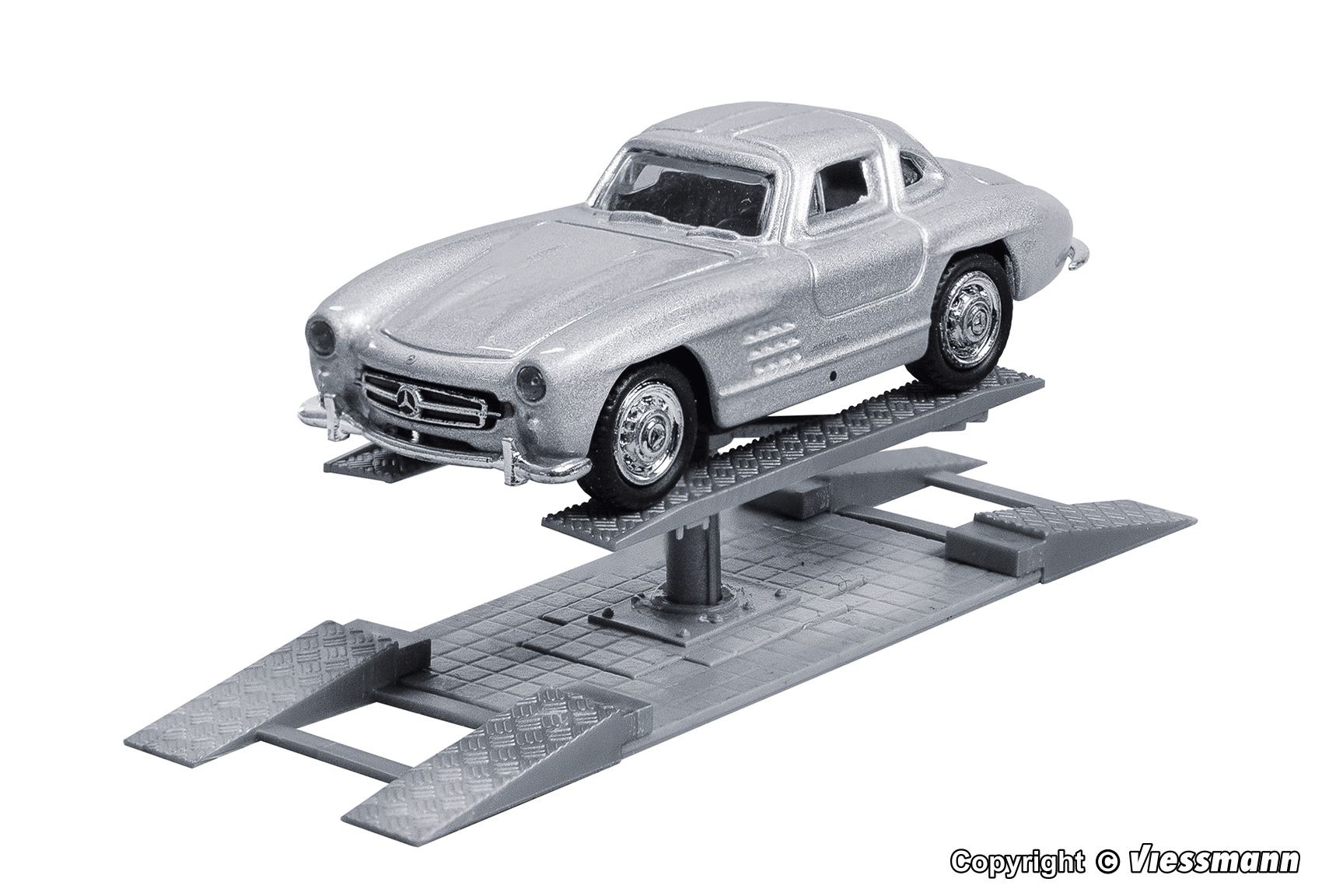 Ein-Säulen-Hebebühne mit Bewegung zur realistischen Ausstattung von Autowerkstätten, Betriebshöfen usw. Der integrierte Digitaldecoder ist multiprotokollfähig und versteht die Formate DCC und MM. Außerdem verfügt das Modell über ein zufallsgesteuertes Schauprogramm (Diorama-Modus). Mit Unterflur-Antrieb. Einbautiefe: 50 mm. Maße: L 6,8 x B 2,0 x H 0,4 ? 2,2 cm. Passt perfekt zum ARAL Tankstelle Vollmer Art. 45156, kibri Art. 38541 und der Viessmann Figur Art. 1538 Schweißer mit Schweißlicht.