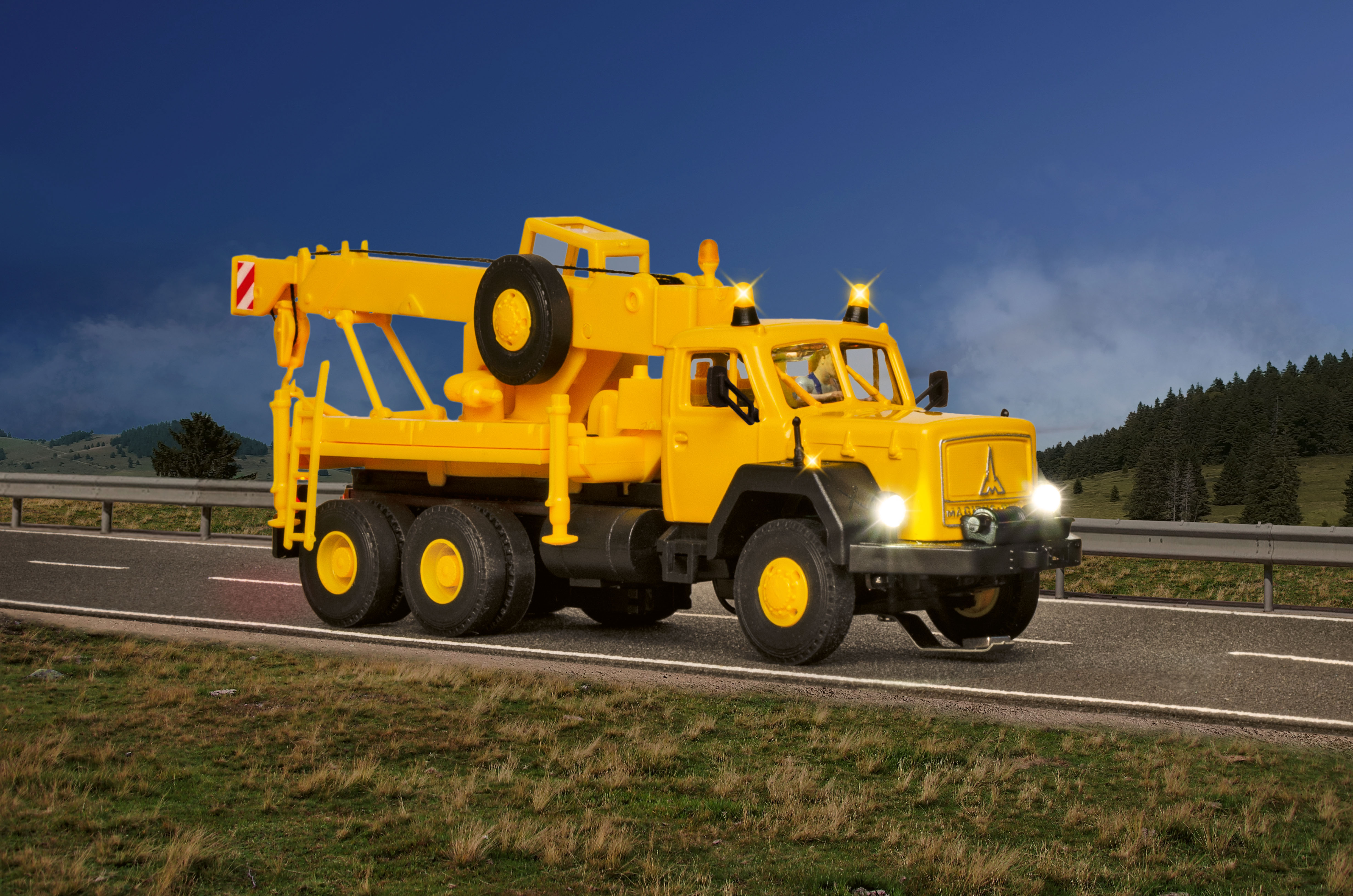 H0 MAGIRUS DEUTZ 3-achs Bergekran mitRundumleuchten, Basis, Funktionsmodell - Wie alle Modelle der CarMotion-Serie verfügt das Fahrzeug über folgende Funktionen: - Lade- und Programmieranschluss - Kurze Ladezeiten durch moderne Li-Po Akkus - Mit einer Akkuladung ist bei normalem Fahrbetrieb mit Wartezeiten und verschiedenen Geschwindigkeiten eine Laufzeit von ca. 4 – 6 Stunden, bei Höchstgeschwindigkeit von ca. 2 Stunden möglich - Einfaches Ein-/Ausschalten mit Hilfe eines Reedkontakts unter dem Dach der Fahrerkabine mit Magnetstift oder Teleskop-Magnetstab Art. 8410 - Infrarot-Sender/-Empfänger für Abstandssteuerung (nur bedingt mit anderen IR-Systemen kompatibel) - Realistische Brems- bzw. Beschleunigungsvorgänge und konfigurierbarer Geschwindigkeit durch drehzahlgeregelten Motor - Freie Ladefläche durch Unterflurantrieb - Kabinenbeleuchtung - Bremslichter und Rückfahrscheinwerfer - Blinker rechts/links und Warnblinker steuerbar - Abblendlicht / Fernlicht - Dachblinker (abhängig vom Fahrzeugtyp) - Einsehbare Fahrerkabine mit Figur - 5-polige Steckkupplung zum Anschluss von CarMotion Anhängern oder Aufliegern - Kompatibel zu vorhandenen Systemen mit Fahrdraht oder Magnetband - Steuerung über Infrarot-Signale, Dauermagnete Art. 8431 in der Straße, elektromagnetische Stopp-Spulen und Fernbedienung Art. 8402 - Selbst ohne Spurhilfen ist eine kurze geradlinige Rückwärtsfahrt mittels Steuerung über die Fernbedienung möglich Vorbilddaten: MAGIRUS DEUTZ Typ 230 D 26 AK KHD Jupiter FlKfz 3-achsig, Radstand 3850/1380 mm, ZF Sechsgang Allklauengetriebe AK 6-80, Viertakt V8 Dieselmotor Typ F8L914, Leistung 169 kW/230 PS, BILSTEIN Bergekran K 12500 H, vollhydraulisch, max. Traglast 12 t, Hubhöhe ca. 11 m. L 11 – 18 x B 3,2 – 4,3 x H 3,9 – 11,5 cm
