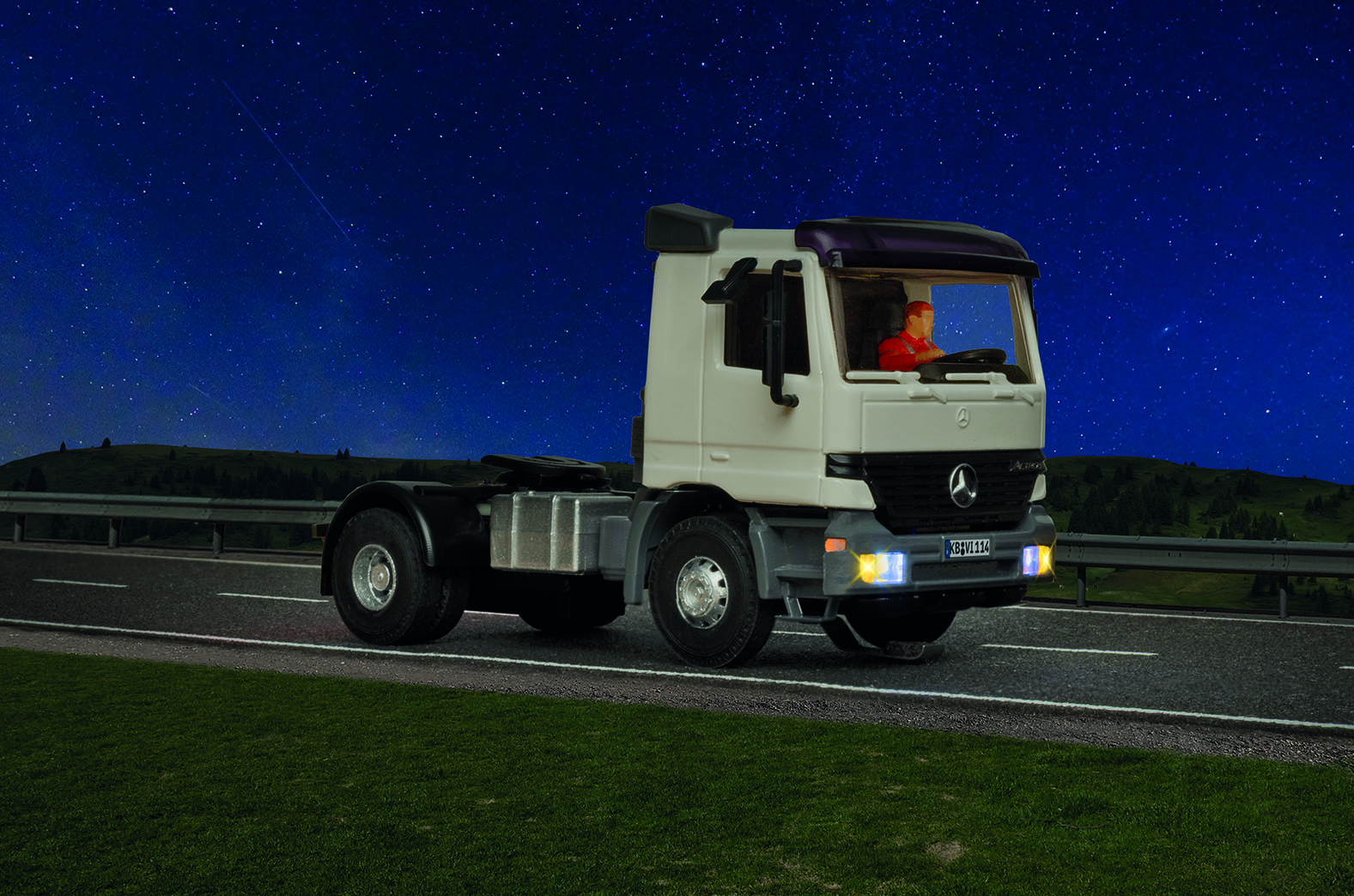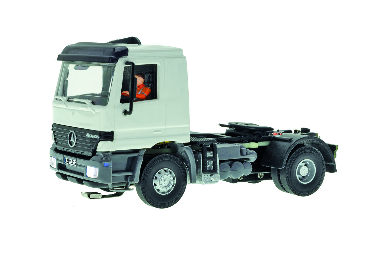 H0 MB ACTROS 2-achs Sattelschlepper, Basis, Funktionsmodell - 1996 stellte Mercedes die ACTROS-Reihe in unterschiedlichen Varianten vor. Dieses Fahrzeug ist mit einem M-Fahrerhaus ausgestattet. Wie alle Modelle der CarMotion-Serie verfügt es über folgende Funktionen: - Lade- und Programmieranschluss - Kurze Ladezeiten durch moderne Li-Po Akkus - Mit einer Akkuladung ist bei normalem Fahrbetrieb mit Wartezeiten und verschiedenen Geschwindigkeiten eine Laufzeit von ca. 4 – 6 Stunden, bei Höchstgeschwindigkeit von ca. 2 Stunden möglich - Einfaches Ein-/Ausschalten mit Hilfe eines Reedkontakts unter dem Dach der Fahrerkabine mit Magnetstift oder Teleskop-Magnetstab Art. 8410 - Infrarot-Sender/-Empfänger für Abstandssteuerung (nur bedingt mit anderen IR-Systemen kompatibel) - Realistische Brems- bzw. Beschleunigungsvorgänge und konfigurierbarer Geschwindigkeit durch drehzahlgeregelten Motor - Freie Ladefläche durch Unterflurantrieb - Kabinenbeleuchtung - Bremslichter und Rückfahrscheinwerfer - Blinker rechts/links und Warnblinker steuerbar - Abblendlicht / Fernlicht - Dachblinker (abhängig vom Fahrzeugtyp) - Einsehbare Fahrerkabine mit Figur - 5-polige Steckkupplung zum Anschluss von CarMotion Anhängern oder Aufliegern - Kompatibel zu vorhandenen Systemen mit Fahrdraht oder Magnetband - Steuerung über Infrarot-Signale, Dauermagnete Art. 8431 in der Straße, elektromagnetische Stopp-Spulen und Fernbedienung Art. 8402 - Selbst ohne Spurhilfen ist eine kurze geradlinige Rückwärtsfahrt mittels Steuerung über die Fernbedienung möglich Vorbilddaten: MB Actros Zugmaschine 1843 V6 Motor, 315 kW / 428 PS. L 7,5 x B 3,5 x H 3,7 cm
