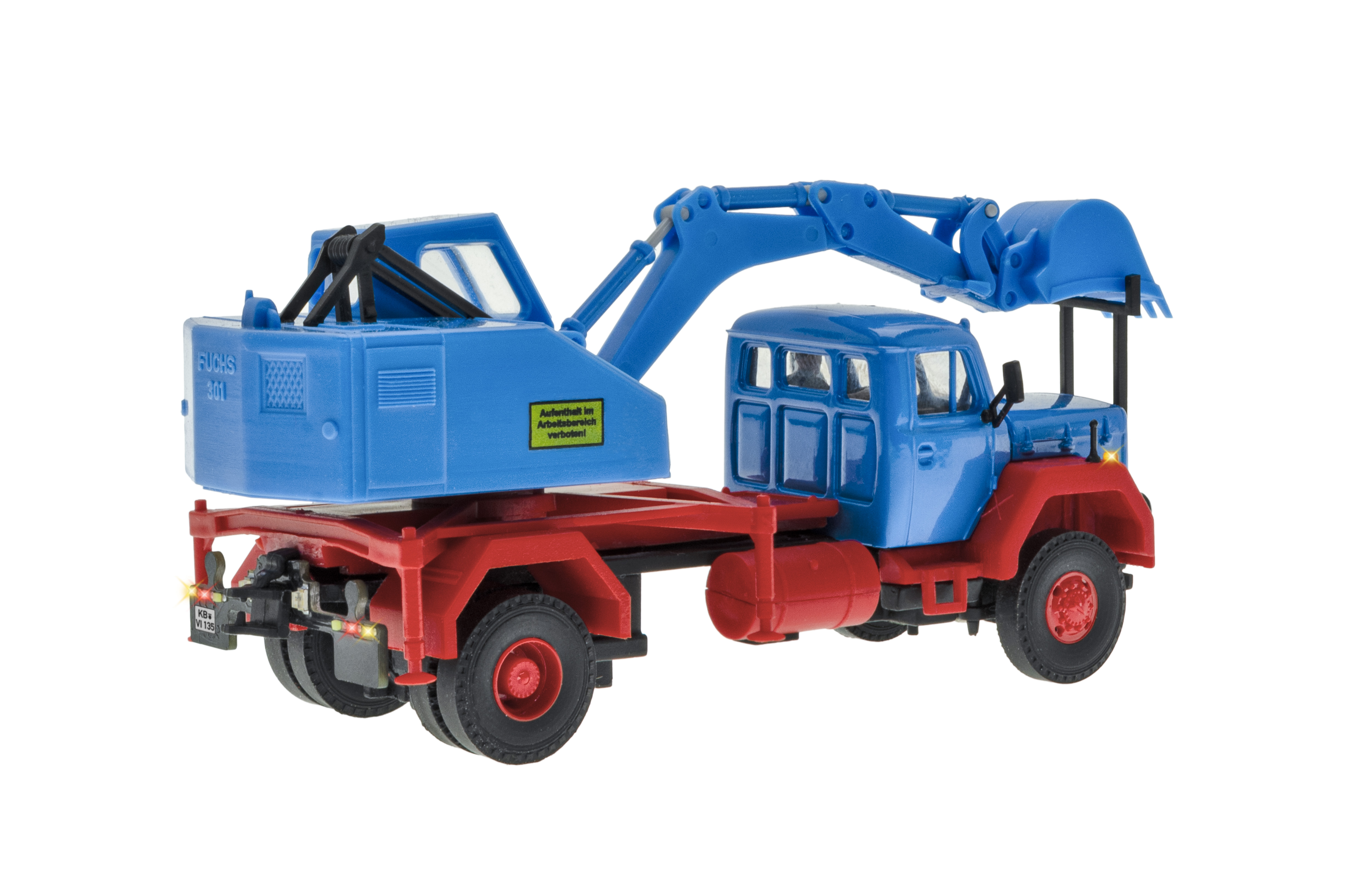 H0 MAGIRUS DEUTZ 2-achs Eckhauber mit Baggeraufbau Basis, Funktionsmodell - Wie alle Modelle der CarMotion-Serie verfügt das Fahrzeug über folgende Funktionen: - Lade- und Programmieranschluss - Kurze Ladezeiten durch moderne Li-Po Akkus - Mit einer Akkuladung ist bei normalem Fahrbetrieb mit Wartezeiten und verschiedenen Geschwindigkeiten eine Laufzeit von ca. 4 – 6 Stunden, bei Höchstgeschwindigkeit von ca. 2 Stunden möglich - Einfaches Ein-/Ausschalten mit Hilfe eines Reedkontakts unter dem Dach der Fahrerkabine mit Magnetstift oder Teleskop-Magnetstab Art. 8410 - Infrarot-Sender/-Empfänger für Abstandssteuerung (nur bedingt mit anderen IR-Systemen kompatibel) - Realistische Brems- bzw. Beschleunigungsvorgänge und konfigurierbarer Geschwindigkeit durch drehzahlgeregelten Motor - Freie Ladefläche durch Unterflurantrieb - Kabinenbeleuchtung - Bremslichter und Rückfahrscheinwerfer - Blinker rechts/links und Warnblinker steuerbar - Abblendlicht / Fernlicht - Dachblinker (abhängig vom Fahrzeugtyp) - Einsehbare Fahrerkabine mit Figur - 5-polige Steckkupplung zum Anschluss von CarMotion Anhängern oder Aufliegern - Kompatibel zu vorhandenen Systemen mit Fahrdraht oder Magnetband - Steuerung über Infrarot-Signale, Dauermagnete Art. 8431 in der Straße, elektromagnetische Stopp-Spulen und Fernbedienung Art. 8402 - Selbst ohne Spurhilfen ist eine kurze geradlinige Rückwärtsfahrt mittels Steuerung über die Fernbedienung möglich Vorbilddaten: MAGIRUS Deutz 230 D 16, 169 kW / 230 PS mit Baggeraufbau FUCHS F301 H. 1965 wurden einige F301 mit einer hydraulischen Baggereinrichtung der Firma Schaeff in Langenburg ausgerüstet, was bei der Kundschaft sehr gut ankam! In die Grundmaschine, die im Wesentlichen dem F301 entspricht, wurden eine Hydraulikanlage und ein etwas stärkerer Motor eingebaut. Ein 700 mm breiter Löffel und ein 570 mm breiter Greifer standen zur Verfügung. Passendes Nachrüst-Set Sound: Art. 8450 L 8,1 x B 3,3 x H 3,6 – 6,4 cm