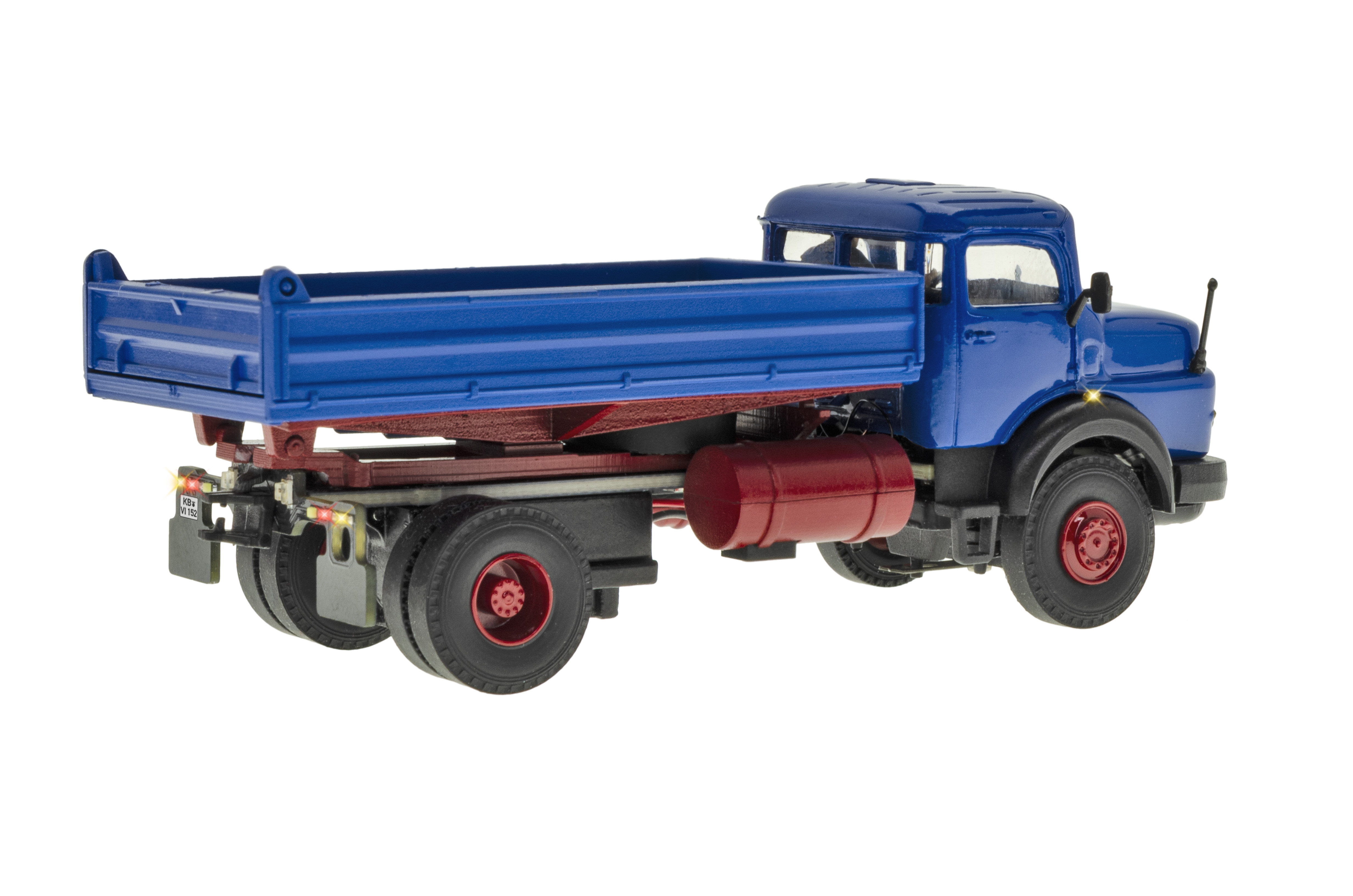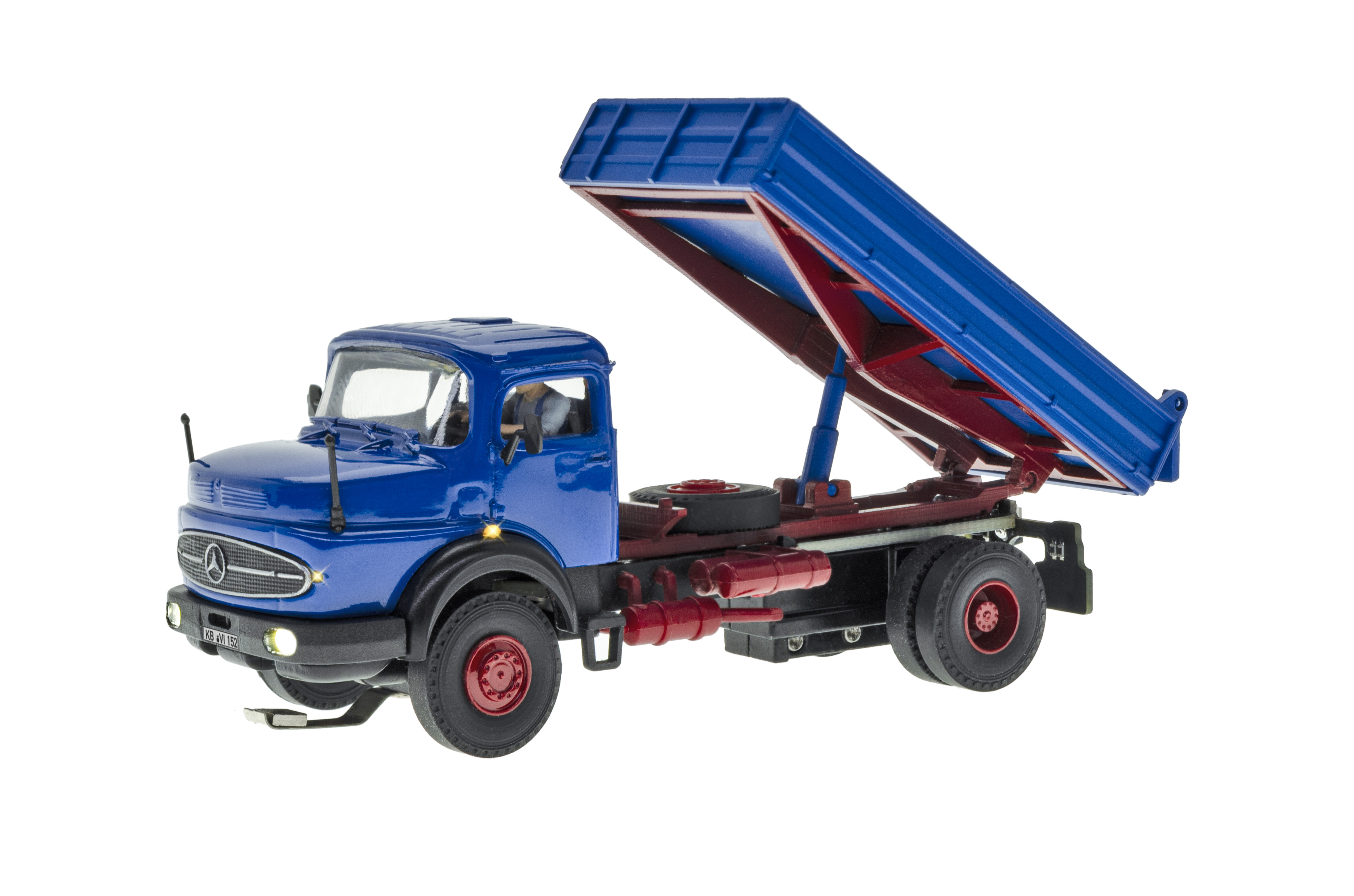 H0 MB Rundhauber 2-achs mit Kipp-Pritsche, Basis, Funktionsmodell - Wie alle Modelle der CarMotion-Serie verfügt das Fahrzeug über folgende Funktionen: - Lade- und Programmieranschluss - Kurze Ladezeiten durch moderne Li-Po Akkus - Mit einer Akkuladung ist bei normalem Fahrbetrieb mit Wartezeiten und verschiedenen Geschwindigkeiten eine Laufzeit von ca. 4 – 6 Stunden, bei Höchstgeschwindigkeit von ca. 2 Stunden möglich - Einfaches Ein-/Ausschalten mit Hilfe eines Reedkontakts unter dem Dach der Fahrerkabine mit Magnetstift oder Teleskop-Magnetstab Art. 8410 - Infrarot-Sender/-Empfänger für Abstandssteuerung (nur bedingt mit anderen IR-Systemen kompatibel) - Realistische Brems- bzw. Beschleunigungsvorgänge und konfigurierbarer Geschwindigkeit durch drehzahlgeregelten Motor - Freie Ladefläche durch Unterflurantrieb - Kabinenbeleuchtung - Bremslichter und Rückfahrscheinwerfer - Blinker rechts/links und Warnblinker steuerbar - Abblendlicht / Fernlicht - Dachblinker (abhängig vom Fahrzeugtyp) - Einsehbare Fahrerkabine mit Figur - 5-polige Steckkupplung zum Anschluss von CarMotion Anhängern oder Aufliegern - Kompatibel zu vorhandenen Systemen mit Fahrdraht oder Magnetband - Steuerung über Infrarot-Signale, Dauermagnete Art. 8431 in der Straße, elektromagnetische Stopp-Spulen und Fernbedienung Art. 8402 - Selbst ohne Spurhilfen ist eine kurze geradlinige Rückwärtsfahrt mittels Steuerung über die Fernbedienung möglich Vorbilddaten: Mercedes-Benz 1624, 6 Zylinder Reihenmotor OM 355, 177 kW / 240 PS. Passendes Nachrüst-Set Sound: Artikel 8451 L 8,2 x B 3,3 x H 3,3 – 4,8 cm