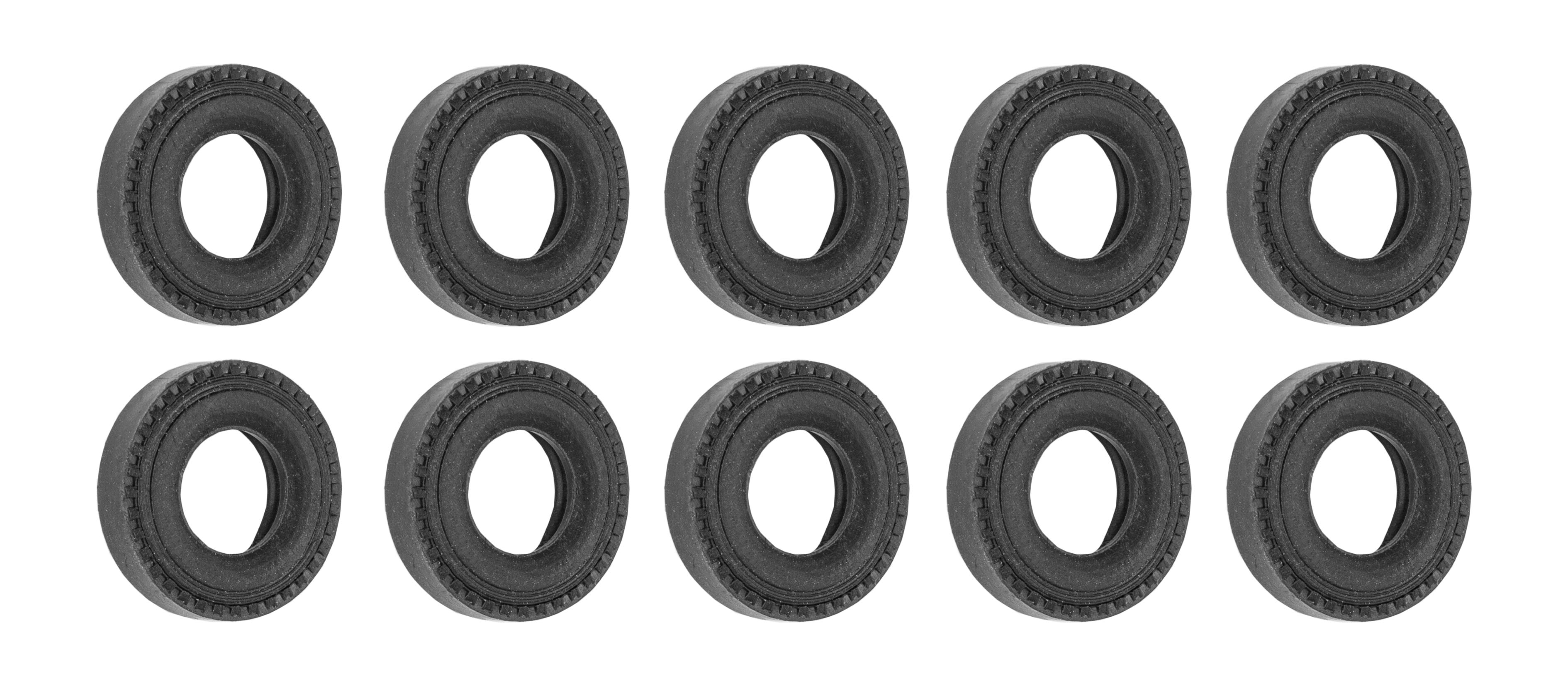 H0 Set Gummireifen, 10 Stück - Mit diesem Set können Sie Ihre CarMotion LKW ausrüsten für den Fall, dass die Originalbereifung Schaden genommen hat oder verschlissen ist. Die Reifen zeichnen sich durch eine gute Traktion, Laufruhe und Spurtreue aus und können auch für LKW-Anhänger verwendet werden.
