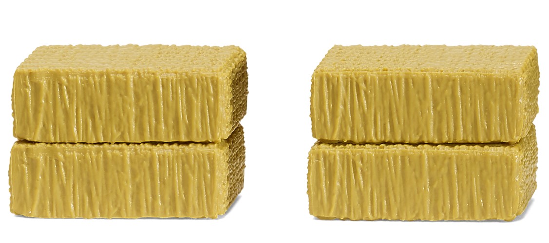Neues Ernte- und Ladegut für die Landwirtschaft Neben Rundballen hält bei WIKING die immer präsenter werdende Form der Quaderballen weiter Einzug. Im praktischen Ernteeinsatz haben die quaderförmigen Ballen gegenüber ihren runden Pendants den großen Vorteil, dass sie deutlich besser gestapelt und somit platzsparend gelagert werden können. Quaderballen können 80 cm bis 1,2 m breit sein, ihre Höhe kann zwischen 50 cm und 1,30 m variieren. Aufgrund der Tatsache, dass das Erntegut in Quaderballen stärker zusammengepresst wird, ist das Gewicht dieser Ballen höher als bei Rundballen. Deshalb werden Quaderballen aufgrund ihres Gewichts und der mächtigen Abmessungen vorzugsweise mit einem Frontlader verladen oder transportiert. Zweiteilige Quaderballen currygelb.