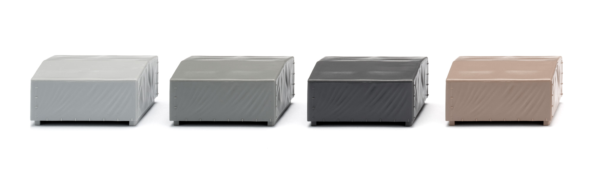 Vier Planen/Verdecke silbergrau, staubgrau, schiefergrau und graubeige.