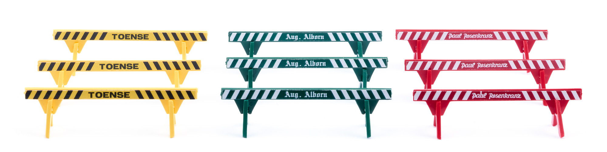 Absperrschranken im historischen Speditionsauftritt Die Baustellen- und Schwertransport-Themen genießen bei WIKING-Freunden einen hohen Stellenwert. Schon deshalb pflegen die Traditionsmodellbauer diese Modell-Zyklen mit immer neuen, vor allem attraktiven Miniaturen. Da ist es nur folgerichtig, dass für die Dioramenfreunde die Absperrschranken im unternehmensindividuellen Auftritt folgen. Dementsprechend hat WIKING dieses Zubehör in den Farben von August Alborn, Paul Rosenkranz und Toense gestaltet. Jeweils drei Absperrschranken: Grün für August Alborn, Rot für Paul Rosenkranz und Gelb für Toense. Den Absperrschranken liegen drei Aufkleberbögen bei.