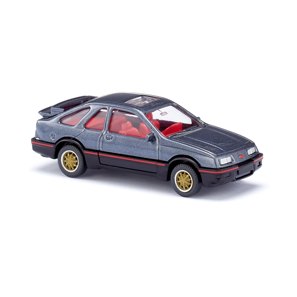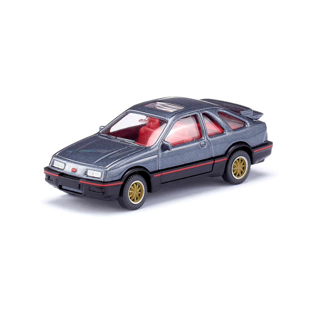Sierra zeigte sich von seiner sportlichen Seite Er hatte in den Achtzigerjahren was, was nicht viele seiner Wettbewerber hatten: Das stromlinienförmige Design des 1982 vorgestellten Sierra verkörperte erstmals Aerodynamik-Kompetenz. Ford unterstrich bei der Präsentation die Eleganz der Sierra-Karosserie und konnte sogar damit auftrumpfen, dass der Sierra 20 Prozent weniger Luftwiderstand als seine durchschnittlichen Wettbewerber hatte und einen beachtlichen cw-Wert von 0,32 erreichte. Der Sierra XR 4i war die Sportversion, die über einen 2,8-Liter V6-Motor mit mechanischer Bosch K-Jetronic-Einspritzung verfügte und 150 PS leistete. Möglich wurde eine Beschleunigung von 0 auf 100 km/h in 8 Sekunden und eine Höchstgeschwindigkeit von über 200 km/h. WIKING gab dem Youngtimer zu Produktionszeiten eine vollendete Karosserie samt charakterprägendem Heckspoiler mit auf den Weg, woraus heute ein durch und durch sportlicher Youngtimer geworden ist. Karosserie mit Heckspoiler mercury grey metallic lackiert und mit Klarlack-Finishing veredelt. Inneneinrichtung verkehrsrot, Fahrgestell mit Kardanwelle schwarz. Goldene Felgen mit gesilberten Rändern. Scheinwerfer vorn gesilbert, Ford-Logofläche rot bedruckt. Heckseitig rote Rückleuchten und Schriftzug Sierra XR 4i und Logo-Fläche rot bedruckt. Seitliche Flanken mit roten Streifen.