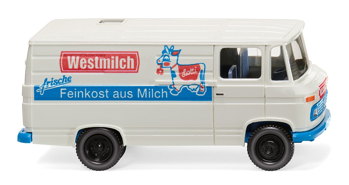 Karosserie perlweiß, Fahrgestell mit Kühlergrill blau, Vordersitze taubenblau. Felgen schwarz. Kühlergrill mit gesilbertem Mercedes-Benz-Stern. Roter Negativ-Schriftzug 'Westmilch' vorn, auf den Seiten und am Heck. Vorne orange bedruckte Blinker. Seitlich zusätzlich Logo von 'Kuh Lotti' sowie Hinweis auf frische Feinkost aus Milch in blau bzw. im negativen blauen Schriftstreifen. Türgriffe seitlich und am Heck schwarz. Handbemalte Frontscheinwerfer. Heckleuchten rot bedruckt.