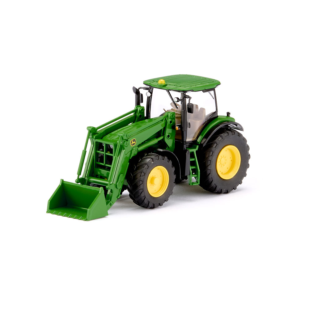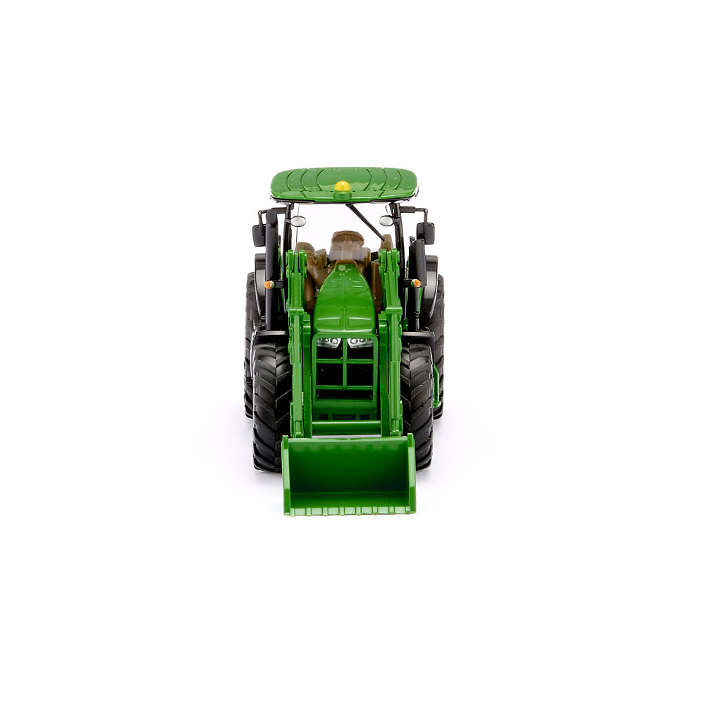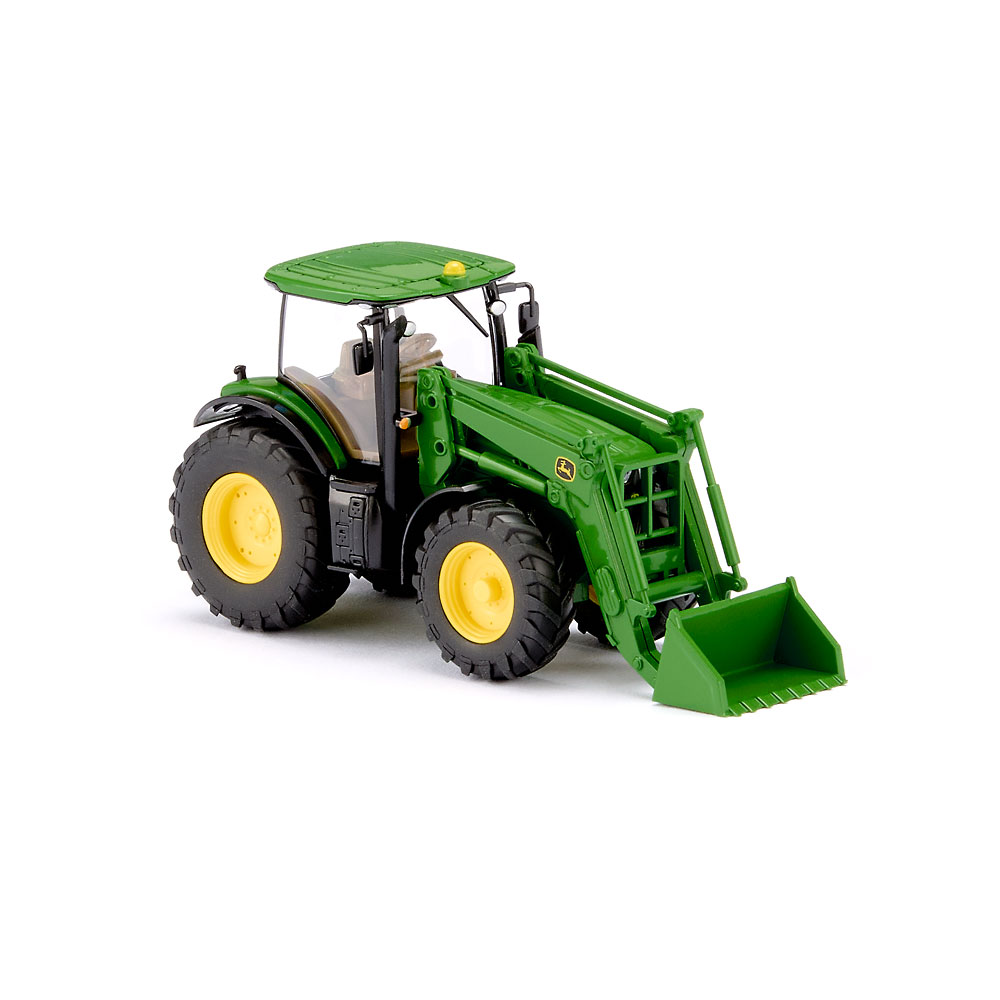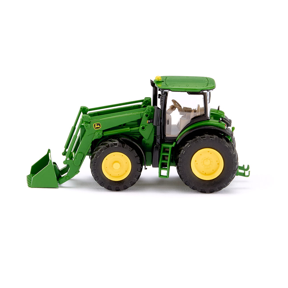 Frontlader schafft beim John Deere neue Flexibilität Der voll bewegliche Frontlader macht deutlich, was landwirtschaftlicher Modellbau bei WIKING heute in der Baugröße 1:87 zu leisten vermag. Mehr Beweglichkeit geht nicht - WIKING beweist mit dem John Deere 7260R ein Höchstmaß an miniaturisierter Funktionalität. Belebt wird das Spektrum detailfeiner Schlepper nach Vorbildern von John Deere mit der Traktorserie 7R. WIKING miniaturisiert damit die erfolgreiche Baureihe, die vor allem durch die prägnante Haubengestaltung und die sichtbar transparenter wirkende Kabine auffällt. Das wertet auch die modellbauerische Wirkung der Miniatur auf, denn hinter der Kabinenverglasung ist ein noch tieferer Blick auf die filigrane Gestaltung des Interieurs möglich. Fahrgestell mit Motorblock und -haube, Stufeneinstieg, Heckhydraulik sowie hintere Kotflügelinnenteile grün gehalten. Vordere Kotflügeloberteile sowie hintere Kotflügelunterteile mit Auspuffrohreinheit mattschwarz. Kabine in transparent mit seitlich schwarzer Begrenzungsbedruckung. Dach grün. Kabinenfrontrahmen mit silbernen Zusatzscheinwerfern mattschwarz. Kühlergrill vorn schwarz eingeschoben mit zweifarbiger Logobedruckung. Inneneinrichtung mit Steuerkonsole und Lenkrad braun. Frontscheinwerfer transparent, Heckleuchten orangetransparent. Blinker orange bedruckt, Seitliche Typenkennzeichnung "7260R" und Schriftzug "John Deere" in schwarz-gelber Bedruckung. Gelbe Felgen. GPS-Empfänger dachmittig orange angeordnet. Frontlader mit grünem Gestänge und Schaufel, seitliche Bedruckung mit John Deere-Logo.