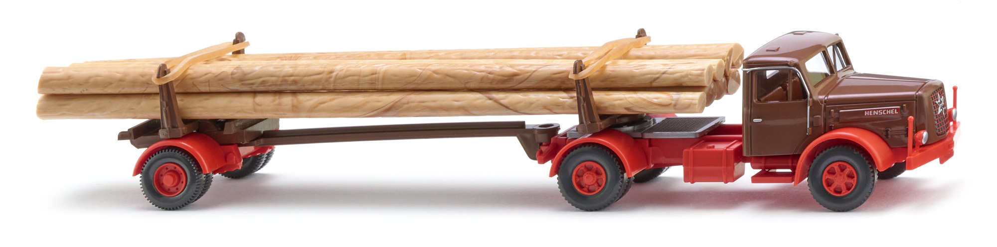 Der Henschel-Hauber für den Waldbetrieb Die großen Hauber der Nachkriegsjahrzehnte hatten sich täglich auch im Forstbetrieb zu bewähren. Dort musste die Kraft unter der Last der schweren Langholzfracht in unwegsamen Gelände auf die Straße gebracht werden. Und der Henschel HS 140 machte seinem guten Ruf damals alle Ehre, wenn er die aus dem Wald gerückten Stämme zum Sägewerk zog. Der HS 140 ist ein typischer Hauber seiner Zeit er prägte die Fünfzigerjahre, ehe im Nachfolgejahrzehnt beim Kasseler Lkw-Bauer die kubischen Frontlenker populär wurden. Eine feine Zugmaschinenkarosserie mit den vorbildgerechten Gravuren von Henschel-Stern und Karosseriesicken ziert das 1:87-Modell. Das Fahrerhaus verfügt über die so typischen bauchigen Türen. Umfangreiche Gravuren von Heckfenster und Dachlüftern prägen das Fahrerhaus. Der Kühlergrill präsentiert den typischen Henschel-Stern, der sogar als separates Teil eingesetzt wird. Hinzu kommen der seitliche Henschel-Schriftzug und die erhabenen Haubenschnallen. Fahrerhaus blassbraun, Inneneinrichtung lehmbraun. Kotflügel, Fahrgestell mit Kardanwelle sowie Felgen blutorange. Eingesetzter Kühlergrill eisengrau mit gesilbertem Henschel-Stern. Nachläufer mit Zwischenstange blassbraun, Kotflügel und Felgen blutorange. Baumstämme braunbeige. Scheinwerfer vorn gesilbert, Rückleuchten rot bedruckt. Grillgravur blutorange.