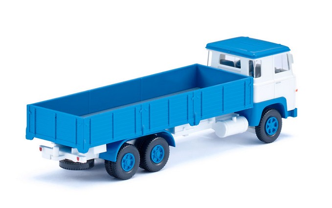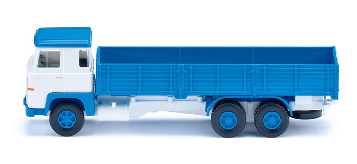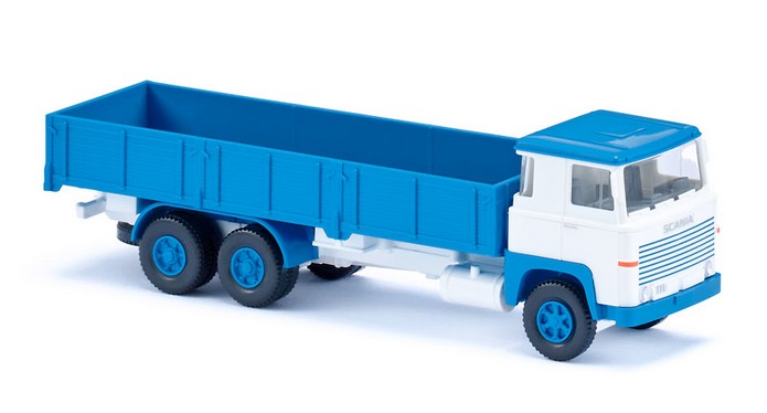 Scania mit Hochbordpritsche mit großer Verkaufsrelevanz Genau in dieser weiß-himmelblauen Farbkombination warb Scania in den Siebzigerjahren für die Frontlenker-Generation der Typenreihe 110. Tatsächlich besaß die Hochbordpritsche eine verkäuferisch hohe Relevanz, weil Scania damit in den skandinavischen Kernmärkten punkten konnte. WIKING reagierte mit einem entsprechenden Fahrerhaus, das sehr bewusst die zweifarbige Gestaltung von Kabine und Dach vorsah. So wurde man der gestalterischen Vorbildpraxis gerecht. Die Traditionsmodellbauer setzten die Scania-Frontlenker-Generation in zahlreichen Kombinationen als Hängergespann und Sattelzug ein. Später half den Modellbauern, dass 1975 die neue Typenreihe 111 optisch lediglich nuancierten Facelift-Charakter besaß, so dass 1977 bei WIKING analog dazu die Typenaktualisierung Einzug hielt und für eine Modellvielfalt bis weit in die Achtzigerjahre sorgte. Fahrerhaus sowie Fahrgestell mit Kardanteil weiß. Vordere Stoßstange und Kotflügel himmelblau. Inneneinrichtung blaugrau. Hochbordpritsche und Felgen himmelblau. Pritscheneinlage blaugrau. Fahrerhausfront mit Scania-Schriftzug und Typenbezeichnung 111 silbern bedruckt, Kühlergrillrippen himmelblau abgesetzt. Türgriffe gesilbert, Blinker orange bedruckt. Scheinwerfer per Hand gesilbert. Rückleuchten rot bedruckt.