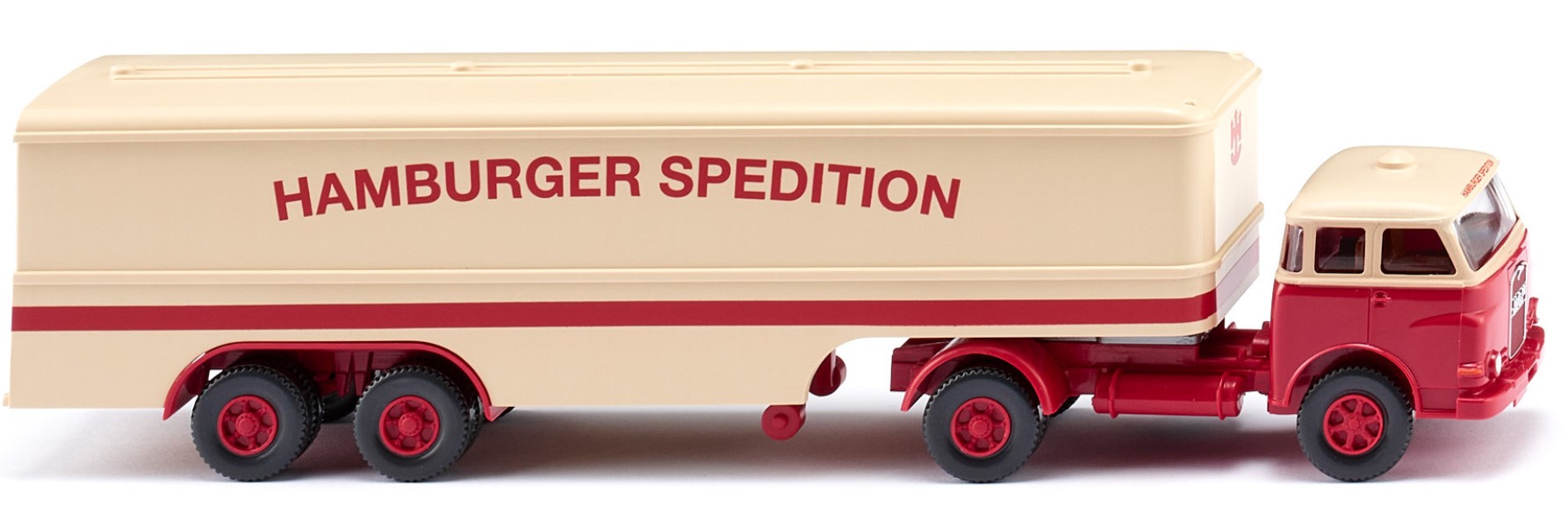 Pausbacke macht Trio der Hamburger Spedition komplett 1977 war es der bekannte Scania 111 LB, der schon 1977 für Frische im WIKING-Programm sorgte. Unlängst erinnerte der Henschel HS 14/16 an die große Zeit der Hamburger Spedition und jetzt macht die MAN Pausbacke aus den beliebten Sattelzügen ein zeitgenössisches Trio! Die Hamburger Spe-dition zählt nach ihrer Gründung 1931 zu den ältesten Unternehmen der Han-sestadt und pflegte einen illustren Fuhrpark großer Lkw-Marken. Mit 80 Jah-ren Speditions- und Logistikerfahrung verstehen sich die Hanseaten als Ex-perten egal, ob Sammelgut-, Container-, Gefahrgut- oder Kühltransporte. Da kommt die Pausbacke für einen authentischen Sattelzug gerade recht: 1967 hatte der WIKING-Chef Fritz Peltzer höchstselbst die MAN Pausbacke unter der Programmnummer 51g noch fulminant, aber treffend als Großen Koffersattelschlepper jetzt mit MAN 10.230 angekündigt. Fast sechs Jahr-zehnte später wird mit dem neuen Sattelzug aus dem einstigen einachsigen Sattelauflieger ein Zweiachser aus neuen Formen. Der Lkw-Klassiker gibt der modellbauerischen Gesamtoptik noch mehr Authentizität. Dabei haben die Traditionsmodellbauer bewusst Wert auf die Vorbildnähe des einstigen WIKING-Modells gelegt und konstruierten in Anlehnung an den baugleichen Einachsauflieger die neue, zweite Version mit feinsten Gravuren. Die Türen am Heck lassen sich selbstverständlich öffnen, das Dach ist mit umlaufender Regenrinne ausgebildet. Außerdem hat WIKING auch an die Positionsleuch-ten an der Kofferstirn gedacht. Rücklichter und Kennzeichen sind am Heck erhaben nachgebildet. Fahrerhausoberteil elfenbeinbeige, Fahrerhausunterteil rot. Inneneinrichtung rehbraun. Fahrgestell und Trilex-Felgen rot. Purpurroter Kühlergrill mit gesil-berten MAN-Zeichen und handbemalten Scheinwerfern. Blinker gelborange. Aufliegerfahrgestell mit Stützbein in rot, ebenso Felgen und Doppelkotflügel. Aufliegerkoffer mit Türen in elfenbeinbeige. Seitliche Kofferbedruckung mit roter Bauchbinde und Schriftzug Hamburger Spedition. Kofferstirn mit Speditionslogo.