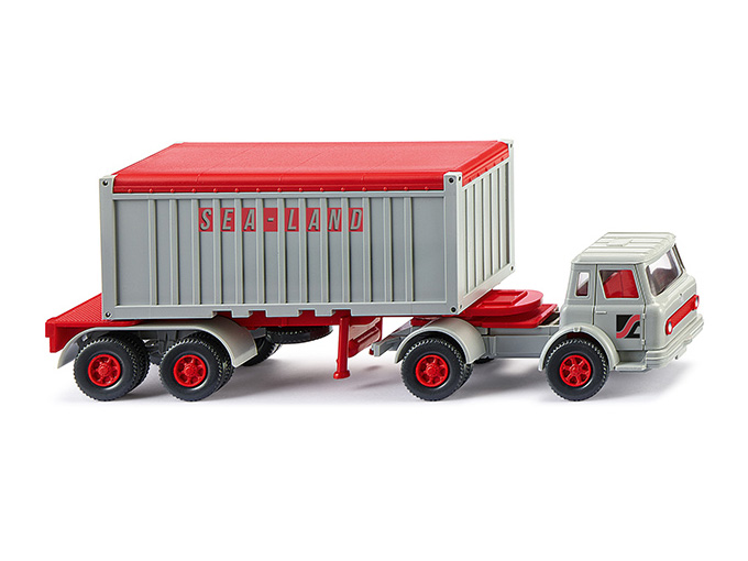 Der IH-Loadstar erscheint als Containeraufliegerzug Amerika lässt grüßen! Mit dem International Harvester (IH) lässt WIKING die Container-Geschichte lebendig werden. Denn der Loadstar machte sich als Zugpferd für den ContainerAuflieger einst einen guten Namen. Den Sealand-Container bringt der International Harvester Loadstar gleich mit. Dabei erscheint der durch und durch amerikanisch wirkende IH Loadstar in der zeitgenössischen Lkw-Gestaltung denkbar ungewöhnlich. Grund dafür ist seine glatte, kühlergrillminimalisierte Frontgestaltung. WIKING benötigte den IH Loadstar einst, um die internationalen Märkte mit einem markttypischen Modell zu beliefern. Fahrerhaus und Fahrgestell mit Kotflügeln dunkel-achatgrau, Inneneinrichtung und Kühlergrill verkehrsrot. Trilex-Felgen ebenfalls verkehrsrot. Seitliche Fahrerhausbedruckung mit Sealand-Logo. Frontseitig silbern bedrucktes IH-Logo. Auflieger mit Stützbein und Trilex-Felgen verkehrsrot. Doppelkotflügel dunkel-achatgrau. Dunkel-achatgrauer Container mit Sealand-Schriftzug. Rückleuchten dunkelrot bedruckt.