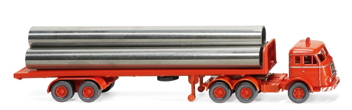 Als im Revier die Röhrentransporte auf Achse gingen Was ein imposanter Transport! Der Henschel zieht die drei großen glänzenden Röhren für den Kasseler Frontlenker einst keine leichte Aufgabe. Der Henschel steht für die zur Mitte der 1950er-Jahre beginnende Epoche von Frontlenkern. Mit dem T hinterm Typenzeichen kürzelten die Kasseler Lkw-Bauer kurzerhand die hauberlose Bauweise der Tramausführung. Mit der Begrenztheit ihrer Pferdestärken konnten sie auf den Autobahnen bestehen, mussten bei Steigungen aber rasch in den Schritttempo-Modus übergehen. Zugmaschine mit leuchtrotem Fahrerhaus sowie Warnlichtsockel. Warnlicht orangetransparent eingesetzt. Schwarzer Kühlergrill mit silbernem Henschel-Stern und -Schriftzug frontseitig eingesetzt. Rehbraune Inneneinrichtung. Fahrgestell mit Doppelkotflügeln und Trilex-Felge leuchtrot. Fahrerhaus mit silbernen Zierlinien und rotweißer Warnschraffur auf der Frontstoßstange. Rückleuchten rot bedruckt. Auflieger mit leuchtrotem Fahrgestell sowie Plattform, Stützrollen, Doppelkotflügeln, Felgen und Achsabdeckung leuchtrot. Heckseitig rotweiße Warnschraffur und rote Rückleuchten. Beladung mit drei silbernen Metallröhren.