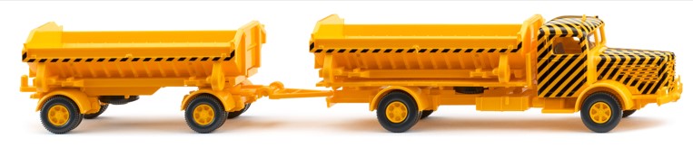 Seitenkipper kommt mit Büssing gleich paarweise Der WIKING-Seitenkipper führte lange in der Markengeschichte ein Schattendasein bis heute. Denn mit dem Büssing 8000 machen die Traditionsmodellbauer aus dem Seitenkipper einen respektablen Kipperhängerzug. Ganz in Gelb versteht sich und dazu noch mit auffällig schwarzer Schraffur-Optik, die damals in Steinbrüchen und auf Straßenbaustellen gar nicht selten war. Die Traditionsmodellbauer rüsten damit den Büssing 8000 erstmals mit dieser Aufbauten-Kombination nach Vidal-Vorbild aus. Verkehrsgelbes Fahrerhaus mit basaltgrauem Interieur. Warndreieck verkehrsgelb eingesteckt. Fahrgestell mit Kotflügel, Trilexfelgen und Kippmuldenaufbau verkehrsgelb. Fahrerhaus mit Haube sowie seitlicher Kipper mit schwarzer Warnschraffur. Scheinwerfer vorn gesilbert. Anhänger mit verkehrsgelbem Fahrgestell, Trilexfelgen, Deichsel und Muldenaufbau. Seitlich schwarze Warnschraffur.