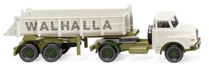MAN Hauber mit Hinterkipper und großen Walhalla-Lettern WIKING macht aus einem Themen-Duo ein spannungsreiches Trio. Nach dem Krupp-Pritschensattelzug und dem Mercedes-Benz 1620 Zement-Auflieger folgt jetzt der MAN Hauber als Hinterkippersattelzug - mit den großen Walhalla-Lettern auf den Muldenflanken versteht sich. Walhalla Kalk aus Regensburg produzierte schon damals gebrannte Kalke, Spezialmischprodukte für den Bau- und Umweltschutz, aber auch ungebrannte Kalke und güteüberwachte Mineralstoffe für den Straßenbau. Für die verschiedenen Transportaufgaben standen entsprechende Lkw-Züge bereit darunter auch der MAN-Hauber mit Hinterkipperauflieger. Zugmaschine: Fahrgestell mit Kardanteil in schilfgrün, Fahrerhaus grauweiß gehalten. Inneneinrichtung mit Lenkrad mausgrau. Vordere Kotflügel chromoxidgrün. Sattelplatte silber. Stoßstange und vordere Kotflügel sowie Felgen chromoxidgrün. Kühlergrill mit gesilbertem Zierrat und MAN-Schriftzug. Fahrerhausseiten mit gesilberten Zierleisten und Türgriffen. Blinker orange bedruckt. Frontscheinwerfer gesilbert, Rückleuchtne rot. Auflieger: Kipper grauweiß, schilfgrünes Chassis mit Stützbein. Seitlicher Schriftzug WALHALLA in mausgrau und heckseitig rot bedruckte Rückleuchten.