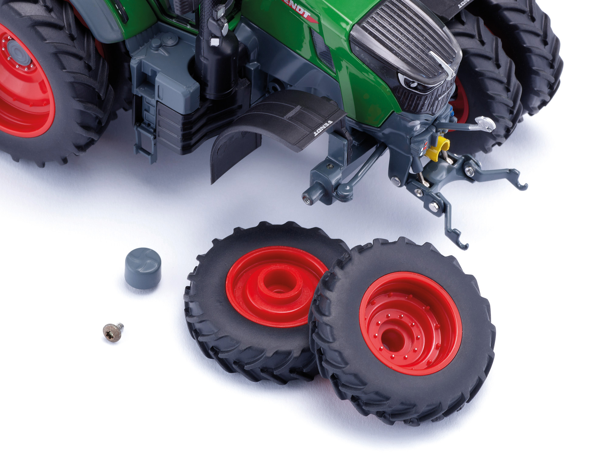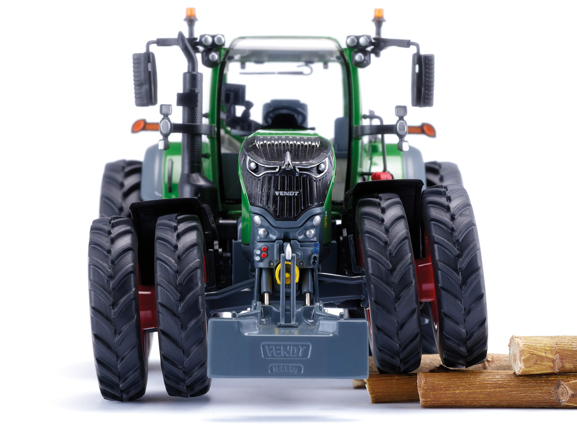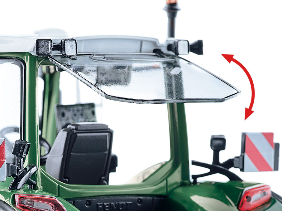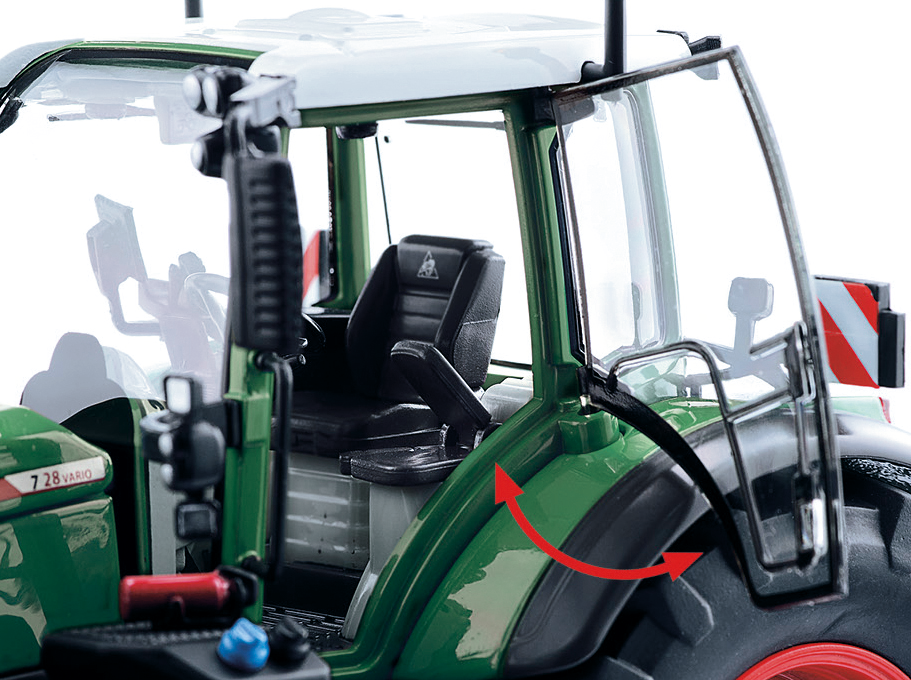 Die US-Version des Fendt 726 Vario hat es in sich Kein Fendt der 700er-Reihe wirkt so kraftvoll, so bullig! Dank der Row crop tires bringt das Vorbild des Fendt 726 Vario seine 256 PS nutzbringend auf den Acker. Damit realisiert WIKING im Präzisionsmaßstab 1:32 eine Version des Marktoberdorfer Schleppers, die vornehmlich in den USA im Einsatz ist. Durch die Doppelbereifung vorne und hinten verbreitert sich die Spur des Schleppers deutlich im Alltagseinsatz bringt das deutliche Vorteile. Damit erreicht der Schlepperfahrer denkbar ausgewogene Eigenschaften für ein breites Arbeitsspektrum auf Acker und Straße. Mehr noch. Durch die vergrößerte Bodenaufstandsfläche eignet sich der Fendt 726 Vario vorteilhaft in der Bewirtschaftung von Grünland. Typisch für Nordamerika sind auch die heckseitigen Blinkerversionen und das in den USA am Heck vorgeschriebene Warndreieck. Dem Modell liegen sowohl die Blinkerflügel als auch die für Europa vorgeschriebenen Warntafeln für die hinteren Kotflügel bei. Damit macht das 1:32-Modell dem Präzisionsmaßstab alle Ehre, denn Sammler können das Modell nach individuellem Wunsch ausstatten und verändern. Seit ihrer Vorstellung begleitet WIKING diese Baureihe, die den Fendt 700 Vario auch bei den 1:32-Maßstabsfreunden zu einem Modellfavoriten machte. Unverwechselbar in der Optik, bemerkenswert in den Details ist das Modell ganz nah am Vorbild entstanden und miniaturisiert. Auf den ersten Blick ist die nach oben gezogene Kabinenfrontscheibe sofort zu erkennen mit doppeltem Wert für Original und Modell. Zum einen wirkt es denkbar authentisch und unterstreicht den Nutzwert im Arbeitsalltag, zum anderen wird der Einblick ins Schleppercockpit möglich. Selbstverständlich realisiert WIKING den Schlepper mit zahlreichen Details, die das Öffnen von Kabine und Motorhaube ebenso einschließt wie den Bedruckungskomfort, der die Authentizität des Fendt-Schleppers in der 32-fachen Miniaturisierung bestmöglich erreicht. Die neue Vario-Generation ist für den multifunktionalen Landwirtschaftsalltag ausgelegt bei WIKING warten im 1:32-Sortiment zahlreiche Landmaschinen, die das Modell genauso wie in Wirklichkeit für den landwirtschaftlichen Einsatz bereitmachen. Die Motorhaube lässt sich öffnen und präsentiert eine detaillierte Motordarstellung, während heckseitige Ober- und Unterlenker beweglich angeordnet sind. Der hintere Oberlenker lässt sich ausziehen, das Zugmaul kann in der Höhe verstellt und angepasst werden. Das Frontgewicht lässt sich abnehmen. An der Kabine sind die Fahrertür und das Heckfenster zu öffnen. Schon dadurch erhält das 1:32-Modell eine lebendige Präsentationsoptik. Überdies kann der rechtsseitige Aufstieg ebenso hochgeklappt werden wie der innenliegende Beifahrersitz. Die Warnleuchten am Dach sind beweglich ausgeführt, ebenso wie die schwenkbaren Außenspiegel. Die Pendelachse lässt sich übers Lenkrad steuern. Detailtreue zeichnet die Kabine mit Instrumenten und Feuerlöscher aus. Die filigrane Bedruckung schließt die Hydraulikanschlüsse ein. Die Räder sind wechselbar ausgeführt und verfügen über magnetische Felgenringe mit einer ebenfalls magnetischen Abdeckung der Radschrauben. Die Row crop tires runden den Gesamteindruck ebenso ab wie das besonders realistisch nachgebildete Heck.
