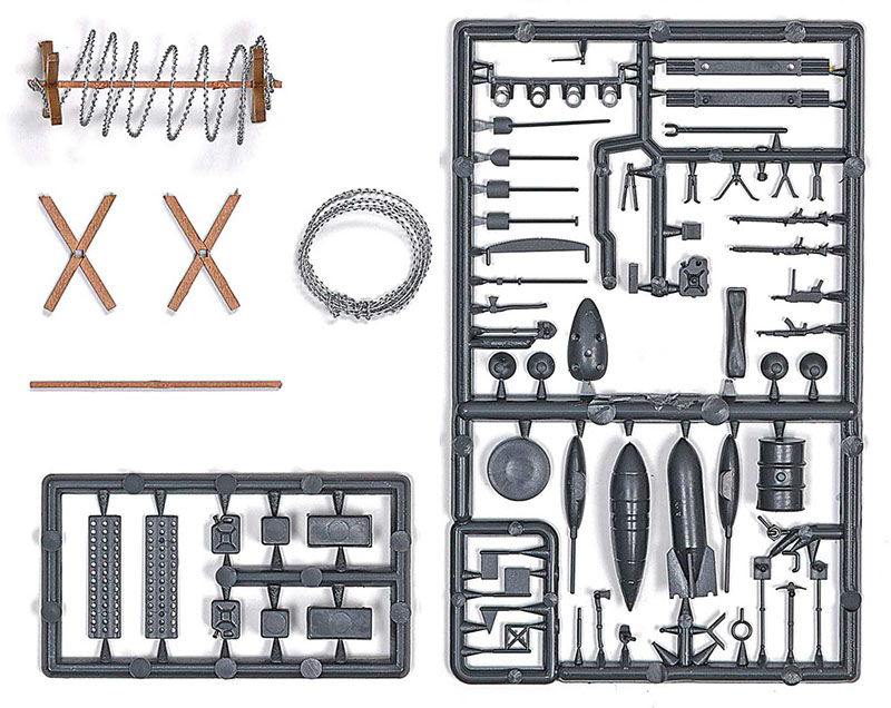 »Habt Acht!!!« Dieses Set beinhaltet einiges an Zubehör, um Modelle und Szenerien detailreich auszustatten, wie beispielsweise spanische Reiter, Stacheldrahtrollen, Kisten, Reifen und Felgen, Stander sowie verschiedenes Werkzeug, wie Spaten, Schaufeln und Haken oder Gewehre, Lautsprecher sogar Bomben sind in dem Set enthalten.