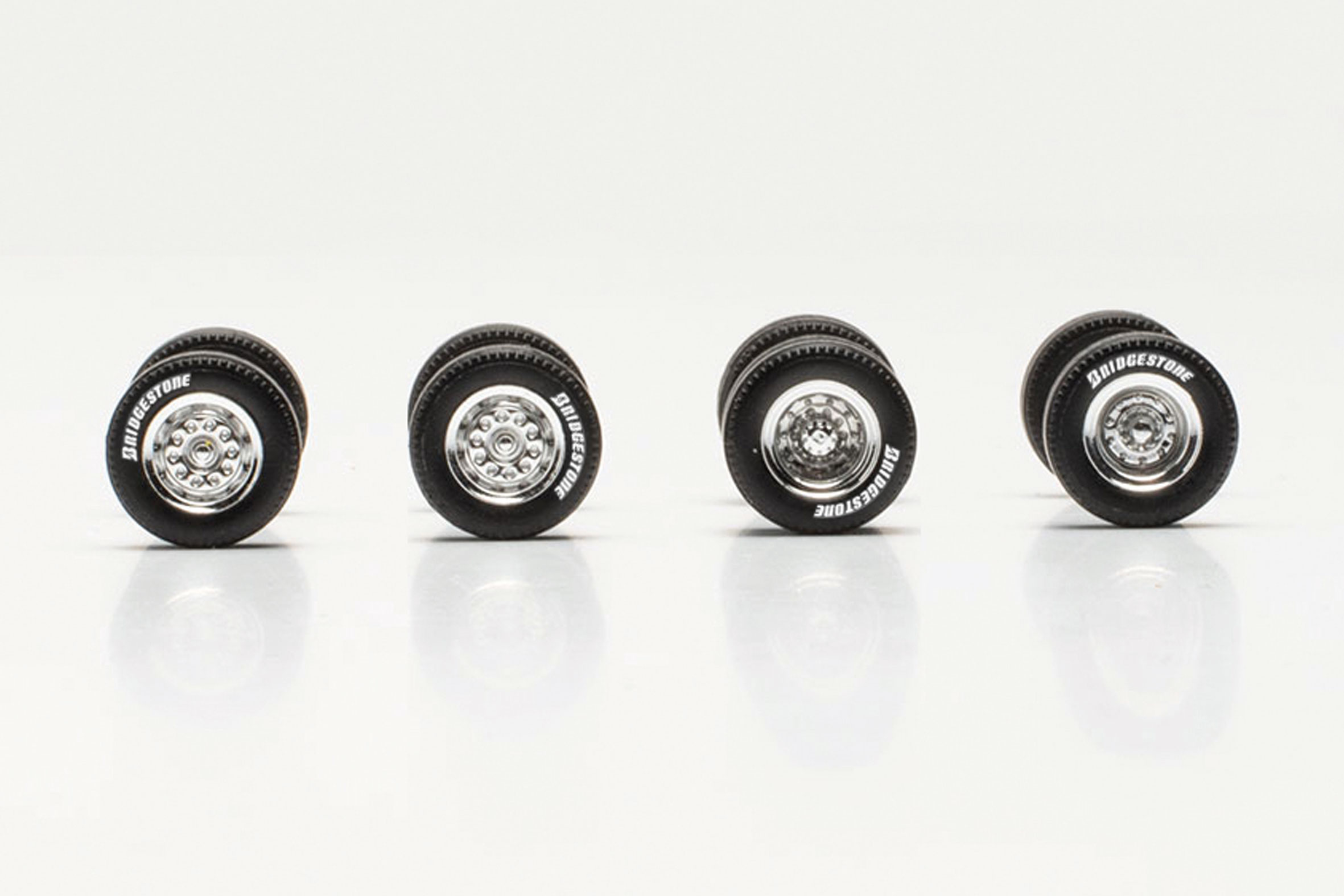 Mit diesem Zubehörset der bedruckten BRIDGESTONE-Reifen auf Chromfelgen kann man wahlweise eine Zugmaschine oder einen Motorwagen (2achs oder 3achs) und einen Anhänger oder Auflieger (2achs oder 3achs) umrüsten. Das Set beinhaltet eine Lenkachse, sowie eine Vor-/Nachlaufachse (mit minimal schmälerer Achse) und zwei Zwillingsachsen die für das Zugfahrzeug herzunehmen sind. Mit den drei verbleibenden Achsen ist dann der Hänger/Auflieger auszustatten.