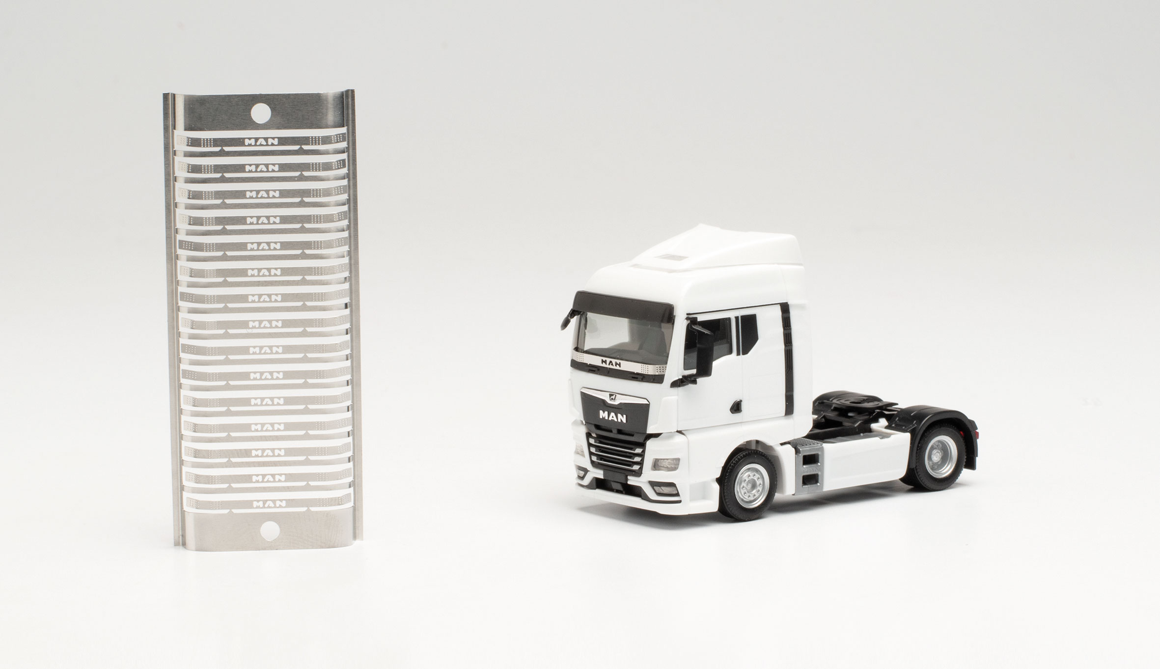 Formneuheit! Als Messingätzteil gibt es ab sofort ein neues Zubehör für die Herpa Zugmaschinen. Beim Vorbild oft als Designelement montiert wird dieses Gitter als Steinschlagschutz für die Windschutzscheibe deklariert. Herpa hat für die Zugmaschinen von Iveco, MAN, Mercedes-Benz, Scania und Volvo das Zubehör jeweils mit der Markenbezeichnung graviert sowie auch mit weiteren Designelementen entwickelt und der jeweiligen Krümmung der Windschutzscheibe angepasst. In jedem Zubehör-Set sind jeweils 15 silberne Messingätzteile enthalten, die einfach hinter der A-Säule der jeweiligen Zugmaschine eingesteckt werden.
