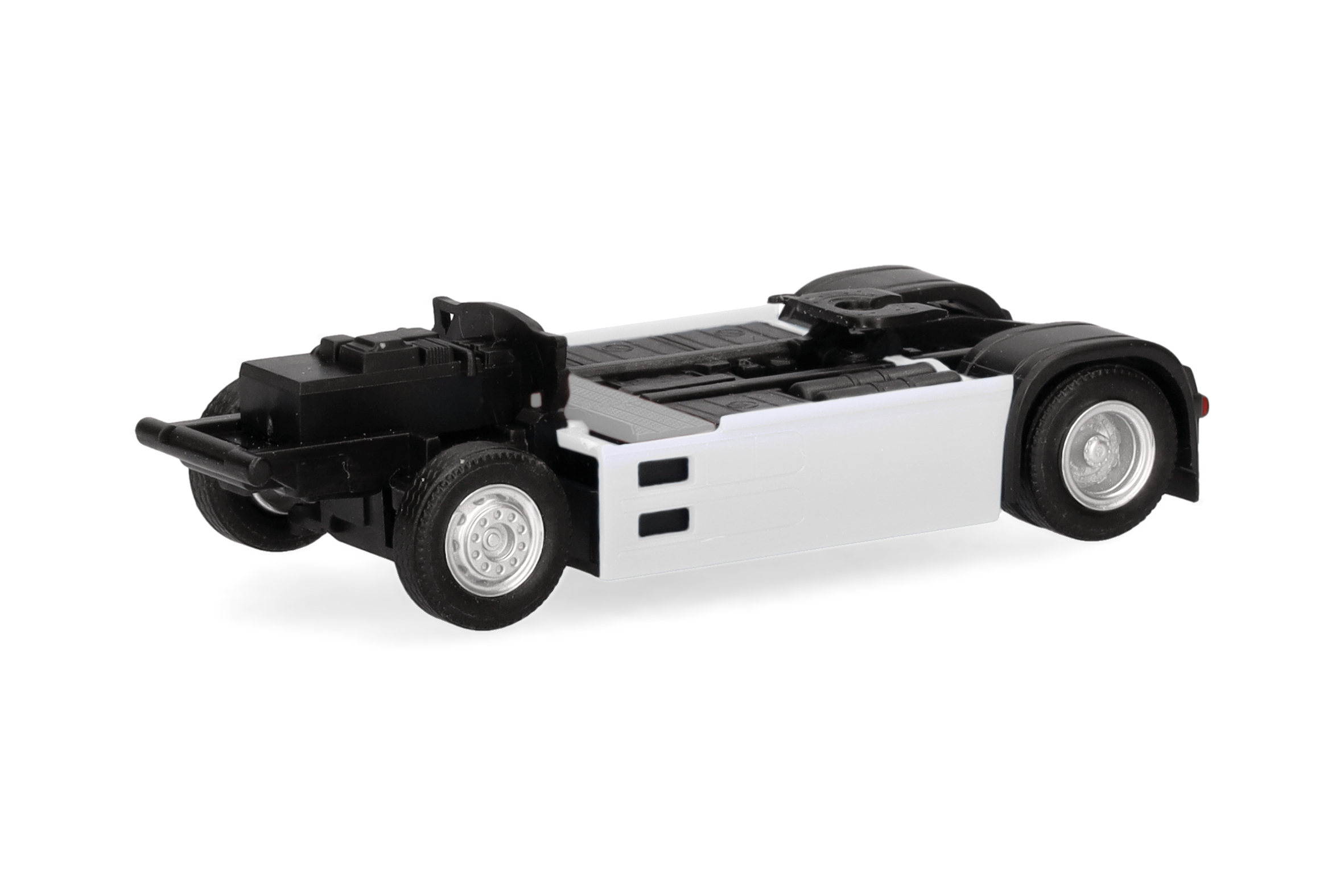 Zum Bau eigener Mercedes-Benz eActros Zugmaschinen wird das passende Fahrgestell mit weißer Chassisverkleidung nun auch den Teileservice ergänzen.