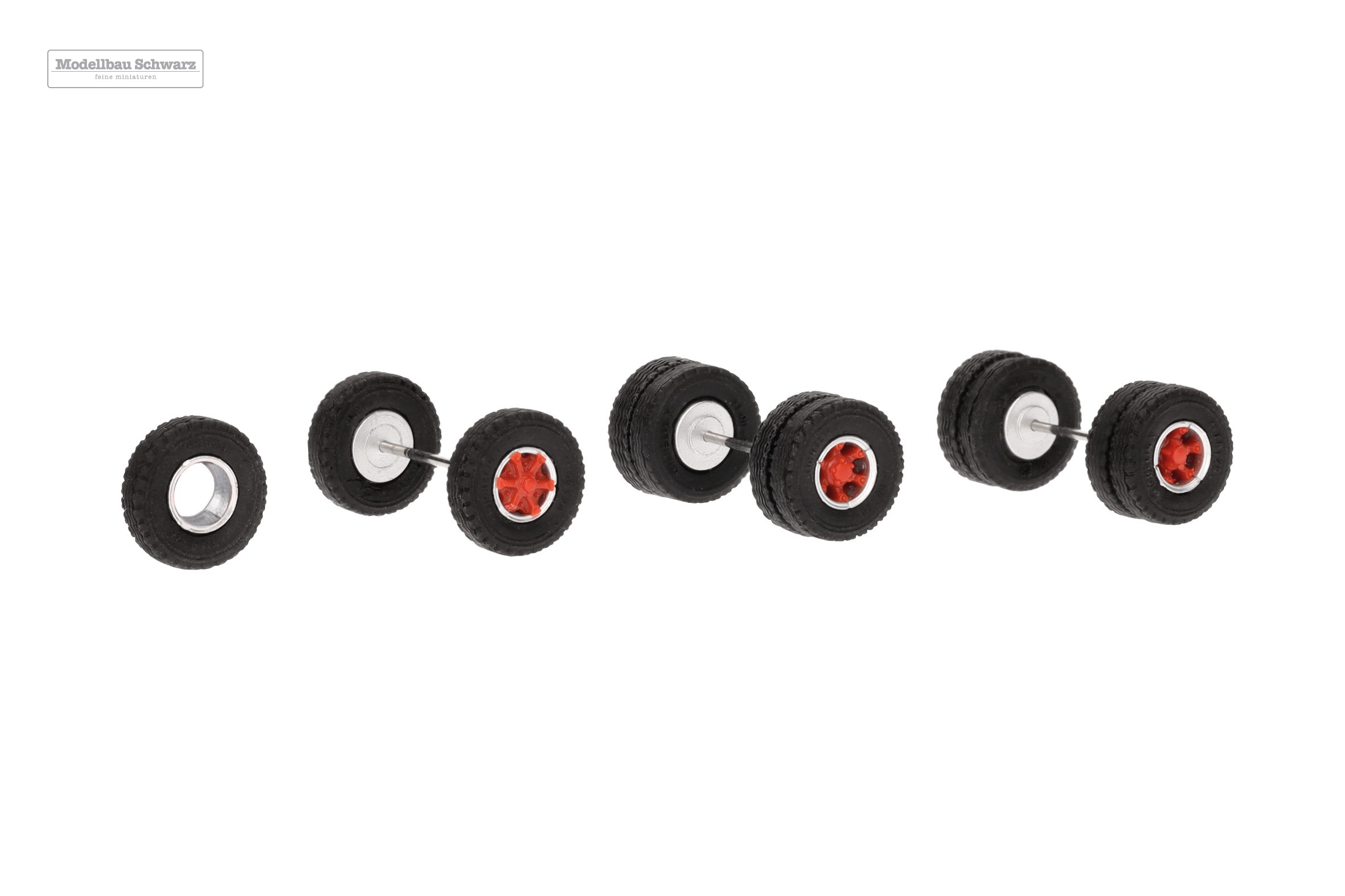 LKW-Sammler lieben auch das Besondere, das Außergewöhnliche. Modellbau Schwarz, steht in der 1:87 Modellwelt genau dafür, feine Modelle, deren Detaillierung über das schon hohe Maß bei Herpa noch hinausgeht. Mit diesem Zubehör Set an Radsätzen, kann man nicht nur Modelle von Modellbau Schwarz ausstatten, sondern auch Herpa, oder andere Modelle im Maßstab 1:87. Dieses Set beinhaltet je eine Lenk-, Antriebs- und Nachlaufachse, sowie ein Ersatzrad für Scania-Vabis. Die Felgen sind in zweiteiliger Trilex-Ausführung und mit 11.00-20 mit etwas grobem Baustellenprofil bereit.