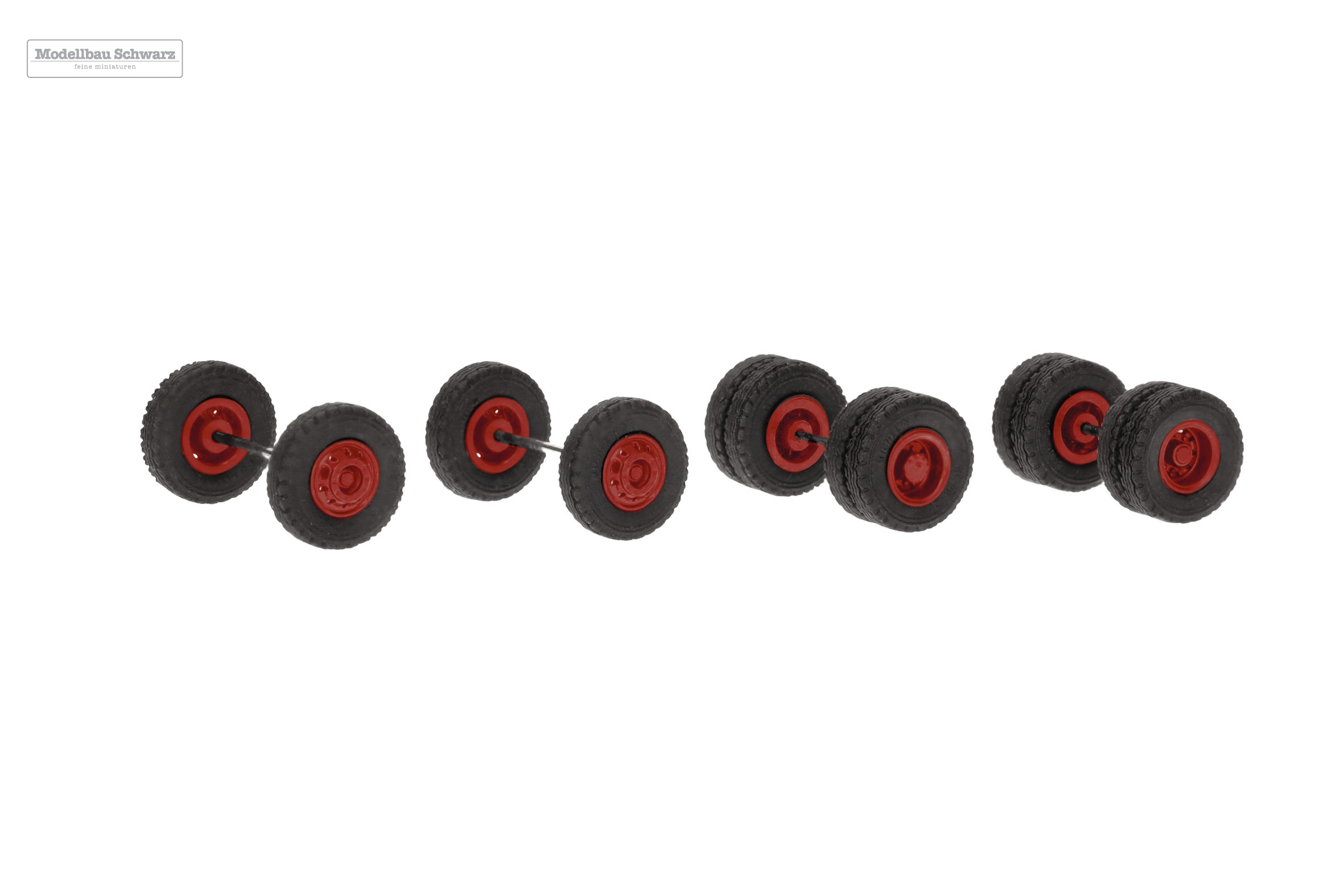 LKW-Sammler lieben auch das Besondere, das Außergewöhnliche. Modellbau Schwarz, steht in der 1:87 Modellwelt genau dafür, feine Modelle, deren Detaillierung über das schon hohe Maß bei Herpa noch hinausgeht. Mit diesem Zubehör Set an Radsätzen, kann man nicht nur Modelle von Modellbau Schwarz ausstatten, sondern auch Herpa, oder andere Modelle im Maßstab 1:87. Dieses Set beinhaltet je zwei Lenk- und Antriebsachsen (eine davon mit AP-Nabe) für Mercedes-Benz. Die Felgen sind in Stahlausführung und mit 11.00-20 mit Straßenprofil bereift.