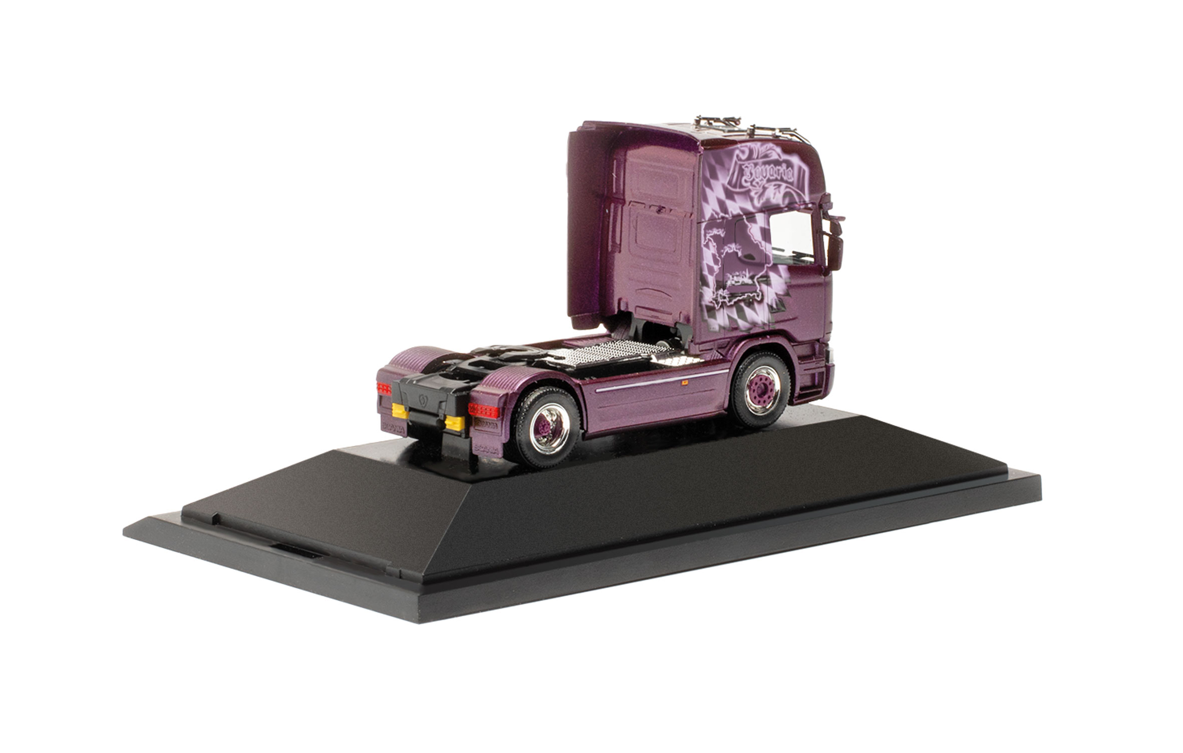 Das Erscheinungsbild ist bekannt. Violettmetallic und in der Regel ein weiß-schwarz gehaltenes Airbrush-Motiv, so lässt Alex Stelzl seine Zugmaschinen lackieren. Auf das Motiv hat in der Regel der Fahrer auch ein bisschen Einfluss. Bevor diese Scania-Zugmaschine aus dem Fuhrpark ausscheidet, liegt es nahe, dass es noch zur Realisierung im Modell kommt. Die Solozugmaschine erscheint in der Reihe der Vitrinen-Modelle.