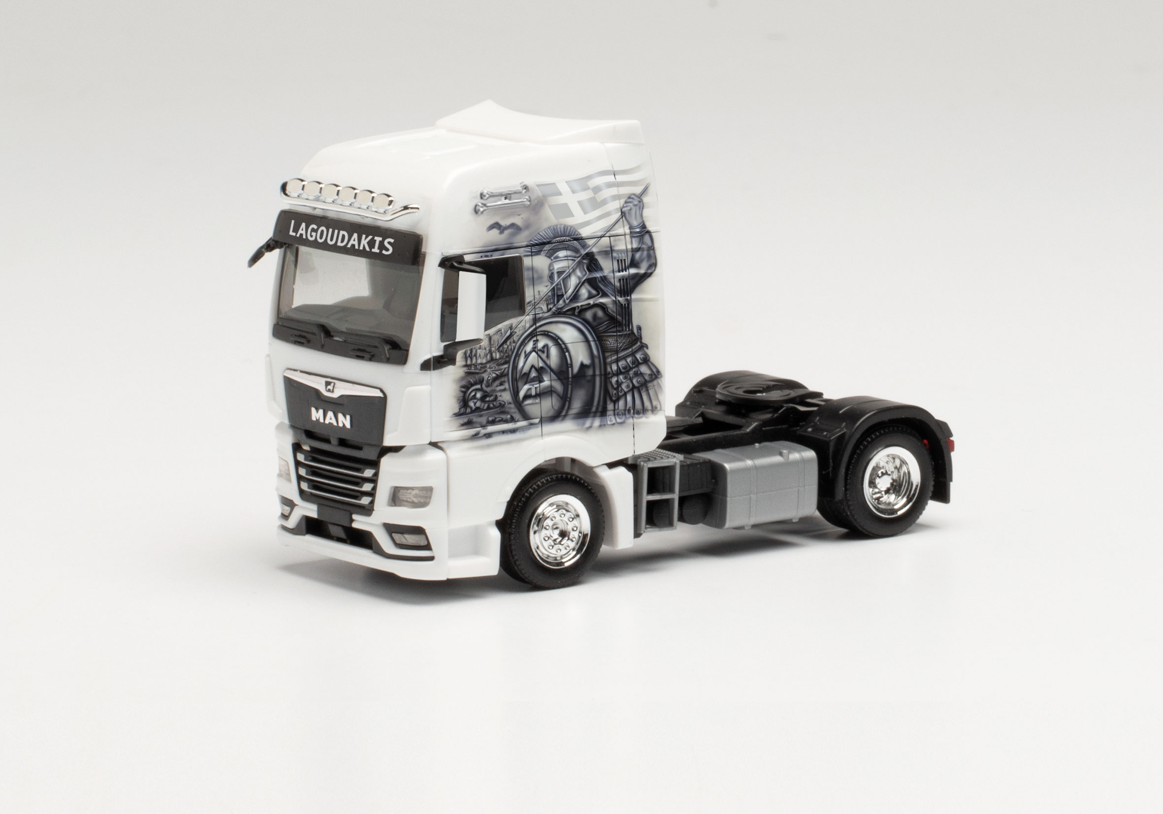 Der in Nürnberg ansässige Spediteur Lagoudakis hat bei Walter Rosner insgesamt neun MAN Zugmaschinen in Auftrag gegeben, von denen die ersten Zugmaschinen nun mit den gewünschten Motiven fertiggestellt wurden. Diese MAN TGX GX der aktuellen Baureihe wurde mit Motiven von Archilles, dem Helden von Troja, lackiert. Einen passenden Auflieger bietet Herpa separat an.