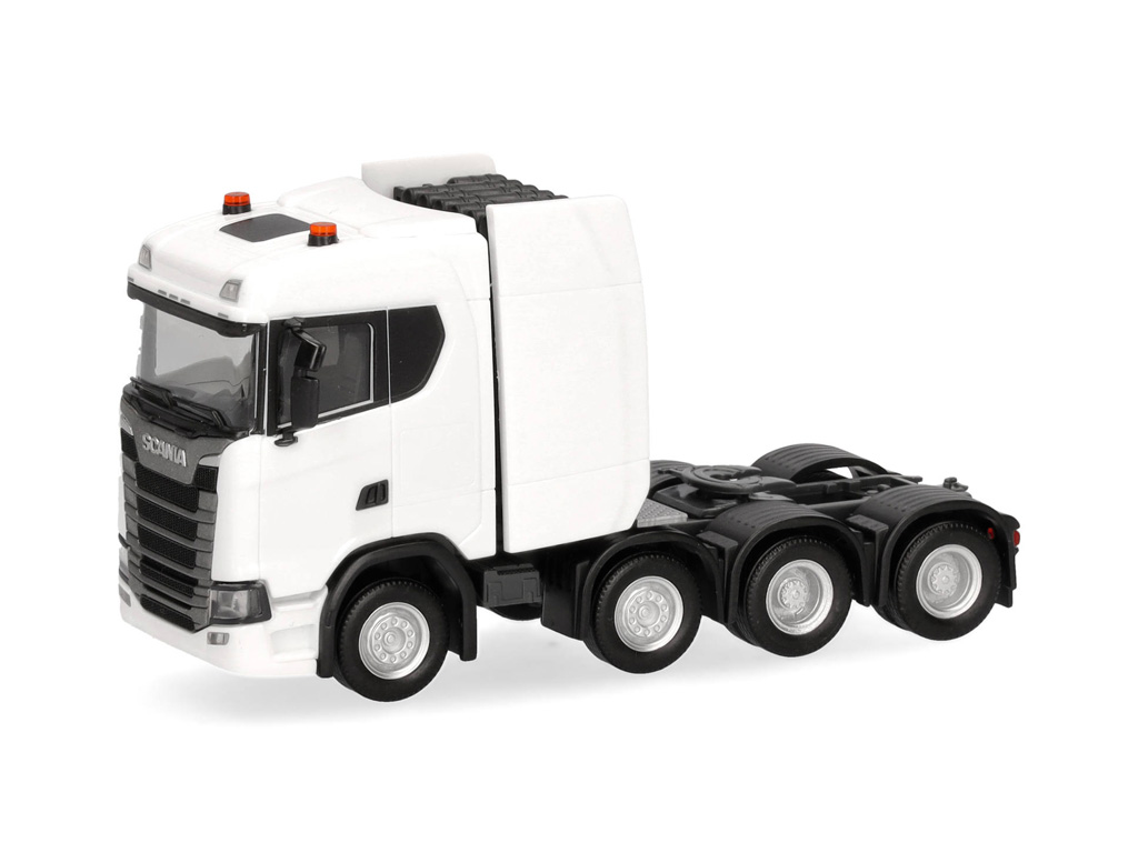 Nach rot und hellblau erscheint die Scania CS Niedrigdach Schwerlastzugmaschine nun in weiß und dient für Bastler und Umbauer als gutes Basismodell für jeden Zweck.