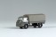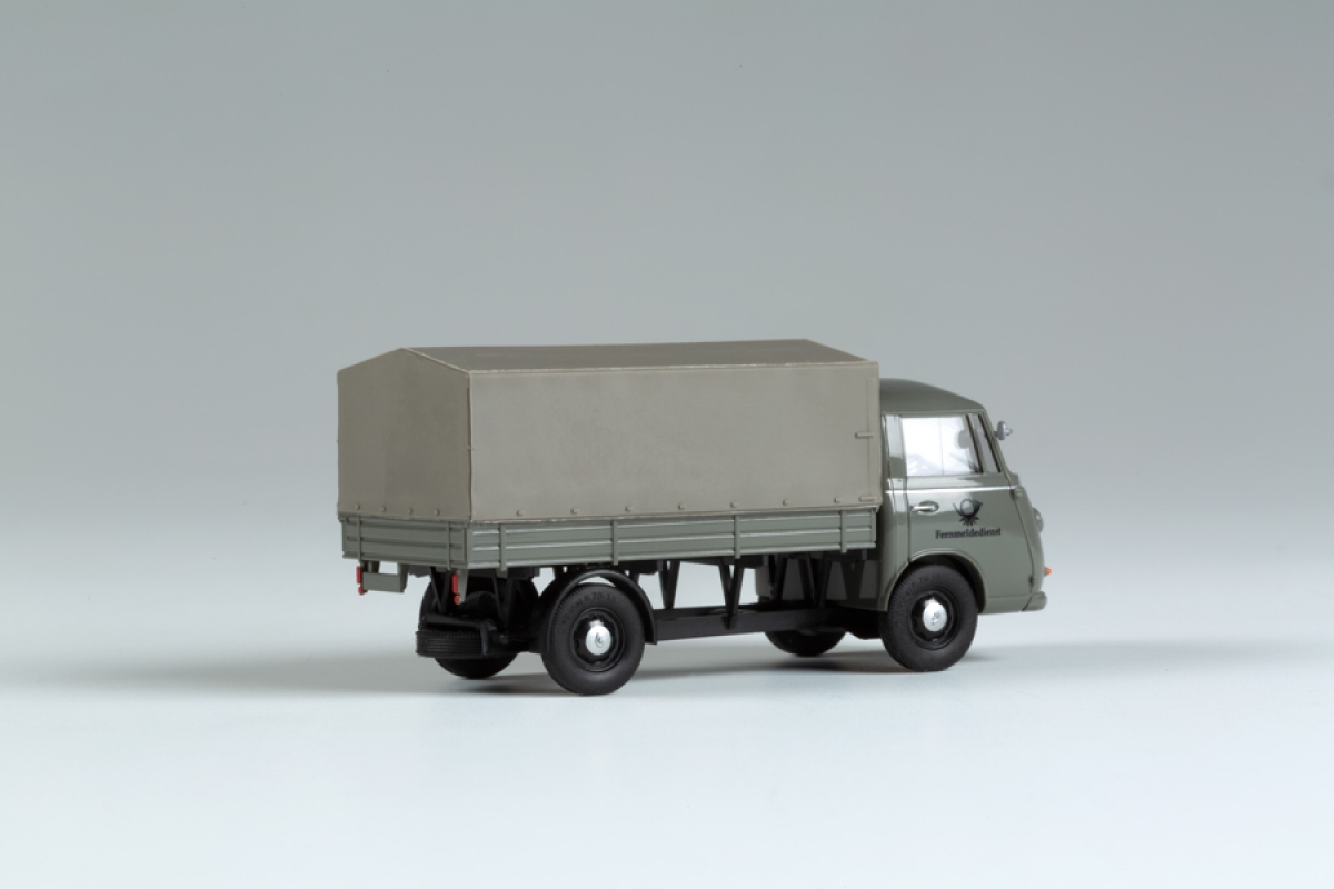 Goliath Express 1100 Pritschenwagen mit Plane Fernmeldedienst - Goliath Express 1100Fertigmodell mit detaillierter Bedruckung. Mit rund 4,6 m² fiel die Ladefläche des Pritschenwagens recht groß aus. Diese wurde u?ber eine aufwendige V-förmige Stu?tzkonstruktion mit dem Fahrgestell verbunden. Deren Bauhöhe war derart bemessen, dass die Räder sich direkt unter der Ladefläche befanden, ohne diese zu unterbrechen. So konnte eine gut nutzbare ebene Ladefläche mit einer perfekten Lastenverteilung realisiert werden. Im Zusammenspiel mit einer maximalen Nutzlast von rund 950 kg ergab sich eine ideale Basis fu?r den Transport von Fässern, Ballen, Säcken, Flaschen, Kisten, Maschinenteilen, landwirtschaftlichen Produkten, Erzeugnissen des Gartenbaues und vielen anderen Gu?tern mehr. Fu?r ein einfaches Be- und Entladen ließen sich zudem die Seitenbordwände allseitig abklappen. Mit entsprechendem Stolz warb das Goliath-Werk in alten Prospekten damit, dass es sich beim Goliath Express 1100 Pritschenwagen um einen äMeister seines Faches“ handele. Und wenn die Standardausfu?hrung des Pritschenwagens fu?r den angedachten Verwendungszweck nicht ausreichte, konnten die Käufer gegen einen geringen Aufpreis die Ladefläche ab Werk auch in Übergrößen ordern. Zusätzlich liegen dem maßstäblichen Modell Kennzeichen und Rückspiegel zur Selbstmontage bei.52 x 20 x 23 mm