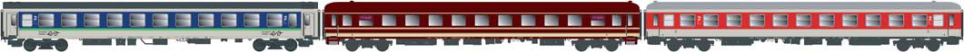 Set 2 European Sleeper Brüssel-Venedig/Brüssel-Prag, bestehend aus einem Liegewagen Bvcmz248.3 in "Euro-Express"-Lackierung, einem Liegewagen Bvcmz248.3 in ehemaliger "DB Nachtzug"-Lackierung und einem 2.-Klasse-Wagen Bomdz236.9 mit Fahrradabteil