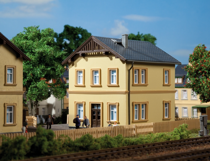 Dienst- und Wohngebäude. Die Bahnmeister betreuten früher einen kleineren Streckenabschnitt als heute. So bestand das Verwaltungspersonal oft nur aus Bahnmeister und Schreiber. Deshalb errichtete man auf größeren Bahnhöfen Gebäude, die außer den Büroräumen im Erdgeschoss noch mindestens eine Wohnung für den Bahnmeister im 1. Stock aufnehmen mussten. Unser Bausatz hat ein solches Gebäude aus dem Jahre 1900 zum Vorbild. Schuppen und Fahrradständer liegen bei.