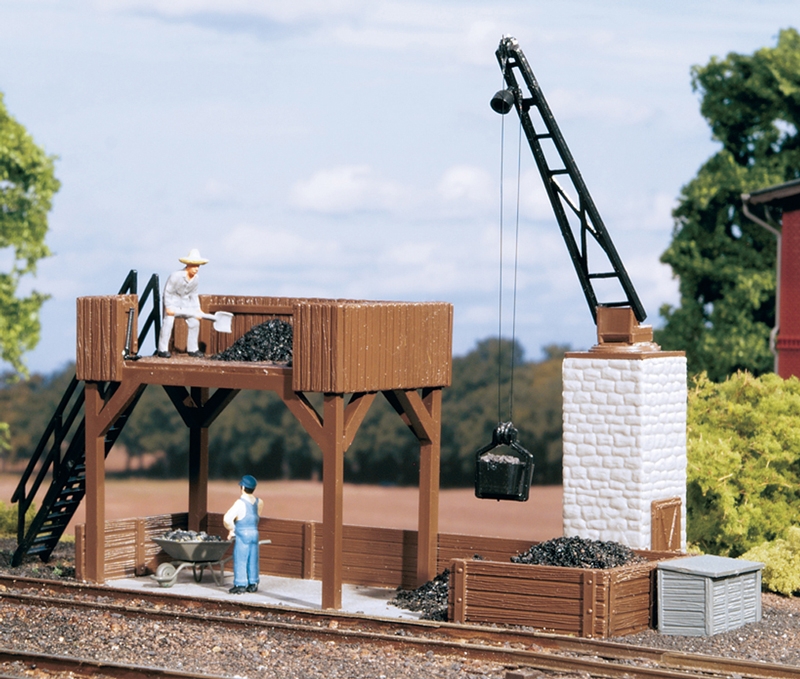So oder ähnlich sahen die "Tankstellen" der Klein- und Nebenbahnen aus. Mit hölzerner Kohlebrücke. Darunter wurde Brennholz aufbewahrt. Der drehbare Kohlekran hat die Bekohlung mit Tragkorb abgelöst. Für Schmalspurloks.