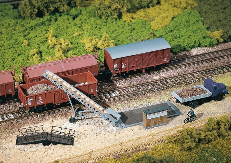 Das dreiteilige Set ist eine Bereicherung für Ihrer Anlage oder Ihr Diorama. Das Förderband wurde an der Ladestraße im Bahnhofsgelände, in bäuerlichen Handelseinrichtungen oder in der landwirtschaftlichen Produktion zur Schüttgutbe- und -entladung genutzt. Es ist auch als Ladegut auf Flachwagen geeignet.