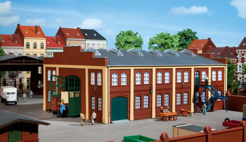 In diesen oder ähnlichen Hallen, deren Baustil in Deutschland und Mitteleuropa weit verbreitet ist, werden in erster Linie Maschinen, Anlagen und Fahrzeuge produziert. Geeignet zur Einfahrt von Lokomotiven und Wagen. Die Dachkonstruktion muss nicht verklebt werden, so dass die "Kontrolle des Innenlebens" jederzeit möglich ist. Durch unser Baukastensystem variierbar. Dem Bausatz liegen Absauganlagen mit Konsolen, Be- und Entlüftungsrohre für Fenster und Dach, Lamellenlüfter, Blindfenster, Schauerdach mit Stahlunterbau und eine Außentreppe bei. Das Geländer ist sehr filigran aus stabilem Karton in Lasercut-Technologie gefertigt. Bitte beachten Sie dazu unseren Basteltipp im Katalog oder unter www.auhagen.de. Bei Erweiterung des Art. 11 422 sollte vor Baubeginn des Grundmodells die Anzahl der Segmente Art. 80 100 feststehen. Das Nachrüsten ist nicht möglich.