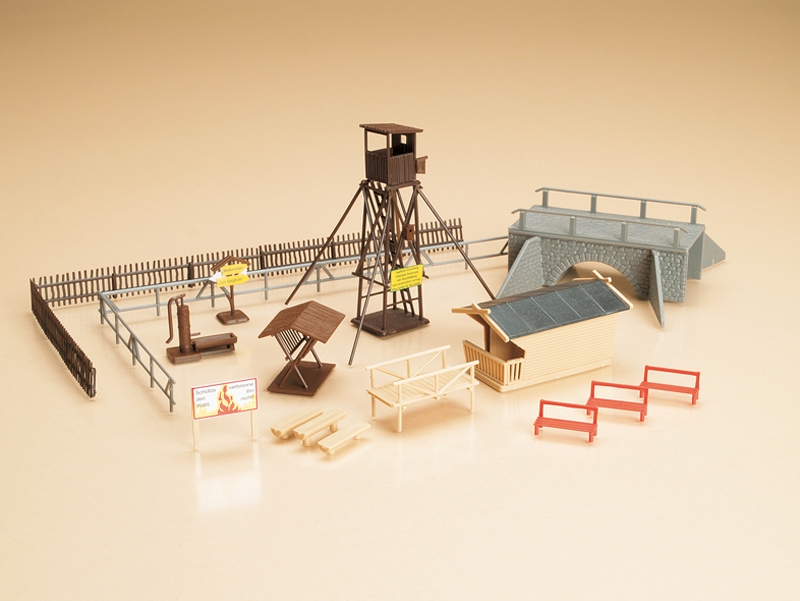 Ein Bausatz reizvoller Kleinigkeiten. Für das Forsthaus Art. 12 225 bestens geeignet. Jagdkanzel, Schutzhütte mit Tischen und Bänken, Wildfütterung, Wegetafel mit Wanderzielen, hölzerne Wasserpumpe, Derbstangenzaun, Feldzaun, kleine steinerne Bachbrücke mit Geländer u. a.