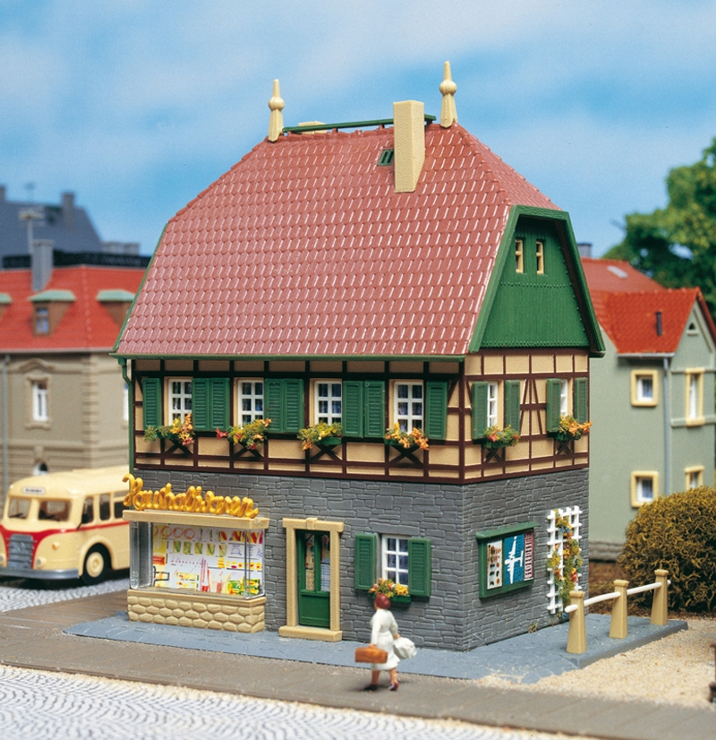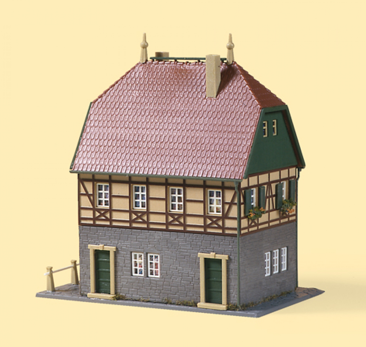 Zweigeschossiges Wohn- und Geschäftshaus mit Fachwerk und Fensterläden im Obergeschoss sowie holzverkleideten Giebeln. Das Ladengeschäft wurde rekonstruiert und erhielt ein vorgebautes großzügiges Schaufenster. Mit Anschlagtafel, Blumenspalier, Säulen mit Geländer und Blumendekomaterial sowie Hofeingang.