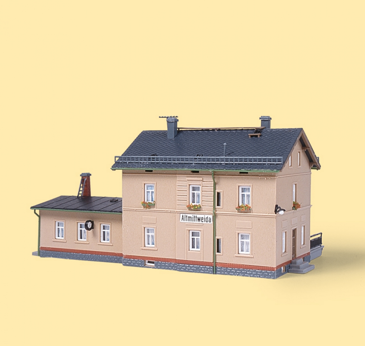 Ländliches Modell mit Expressgutannahme und -ausgabe im Anbau, Bahnsteig mit Auffahrt, Bahnhofsuhr u. a.